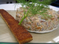 Muotoile massasta stanssilla (tai vaikka kahvikupilla) pyöreä kiekko lautaselle ja tarjoa saatavilla olevan, paahdetun leivän kera. Koristele tillillä.