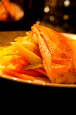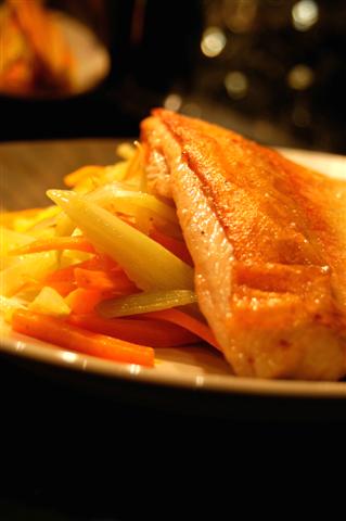 Kultakirjolohta sekä höyrytettyjä kasviksia