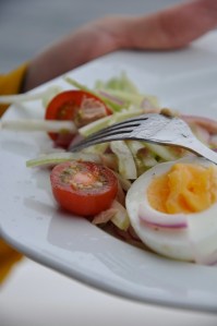– 2 prk laadukasta säilyketonnikalaa (esim. Calvo) – 3 vartta varsiselleriä – 10 kirsikkatomaattia – 4 keitettyä kananmunaa – oliiviöljyä – merisuolaa ja mustapippuria myllystä – rapeakuorista leipääVALMISTUS