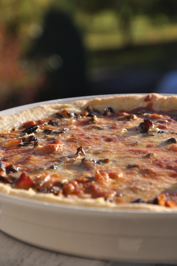 Paista pekonit, sipulit ja sienet pannulla. Asettele täytteet piirakkapohjan päälle. Sekoita kerma, maito, munat ja raastettu manchego keskenään ja kaada seos täytteiden päälle. Mausta suolalla ja pippurilla ja levitä pinnalle mozzarella. Paista 170 c uunissa n. 45 minuuttia tai kunnes pinta on kauniin ruskea.
