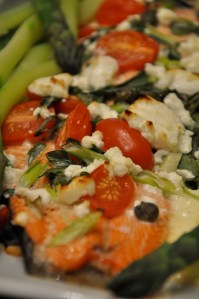 – 600 g lohta fileenä – 1-2 rkl pikkuisia kapriksia – 5-10 miniluumutomaattia – 2 kevätsipulin vartta – 100 g kuoretonta chevreä – 1 dl kermaa – ½ sitruunan mehu – suolaa ja mustapippuria maun mukaan – lisukkeeksi vihreää parsaa keitettynä VALMISTUSLaita lohifile uuninkestävään vuokaan nahkapuoli alaspäin ja ripottele pinnalle kaprikset, puolitetut miniluumutomaatit, sitruunan mehu, suolaa ja mustapippuria sekä pienennetty kevätsipulinvarsi ja chevre paloina. Kaada päälle kerma ja kypsennä uunissa 200 asteessa n. 15 minuuttia paksuudesta riippuen.