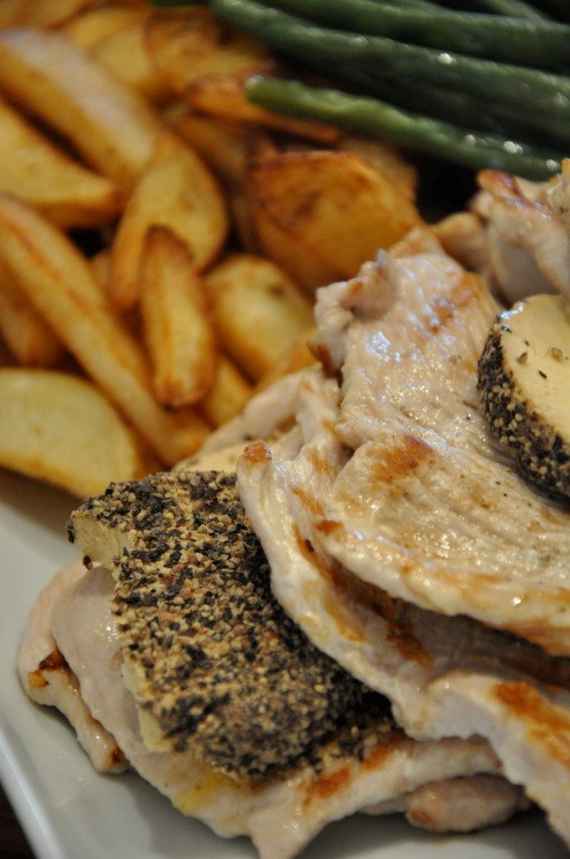– 4-6 kalkkunan tai broilerin fileetä – 1 pkt Mustapekkajuustoa – 1 pussi ranskanperunoita – merisuolaa, pippuria ja haluamiasi mausteita.VALMISTUS
