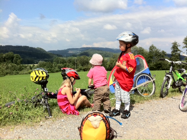 Lasten kanssa ajetaan tasaisempia teitä. Pienin kulkee kärryssä, Julia ja Oliver ajavat itse. Eväät pitää aina saada matkaan!