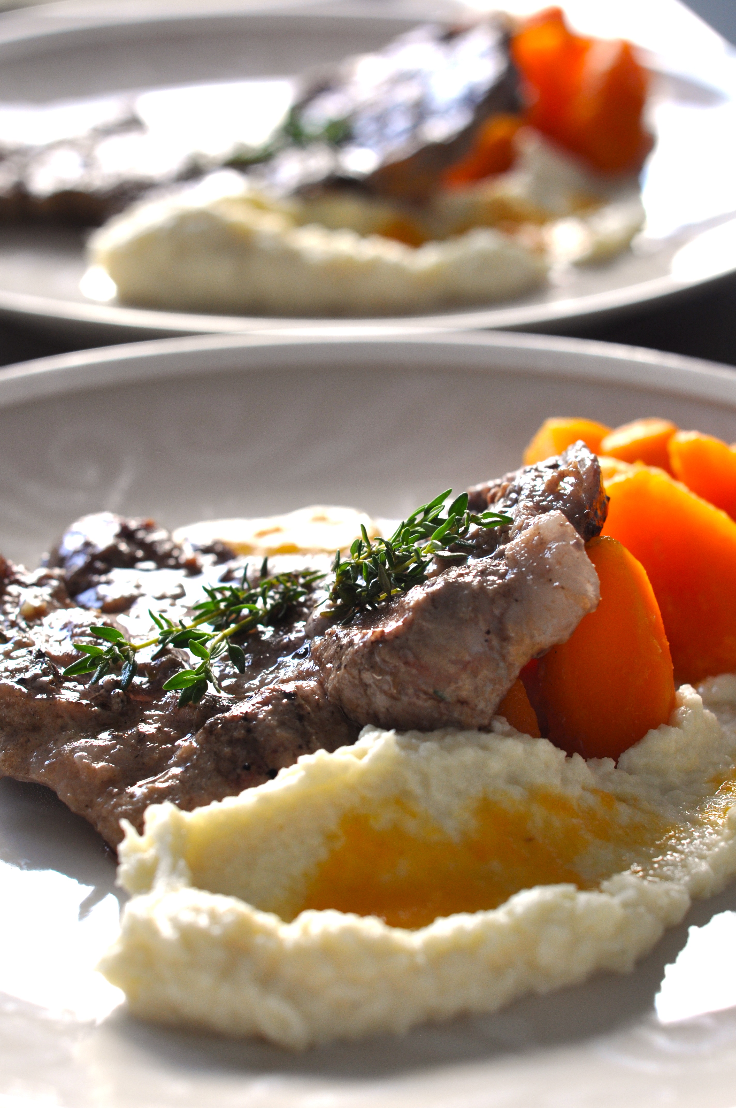 Grillattua yrttipossua, kukkakaalipyree ja voiporkkanat
