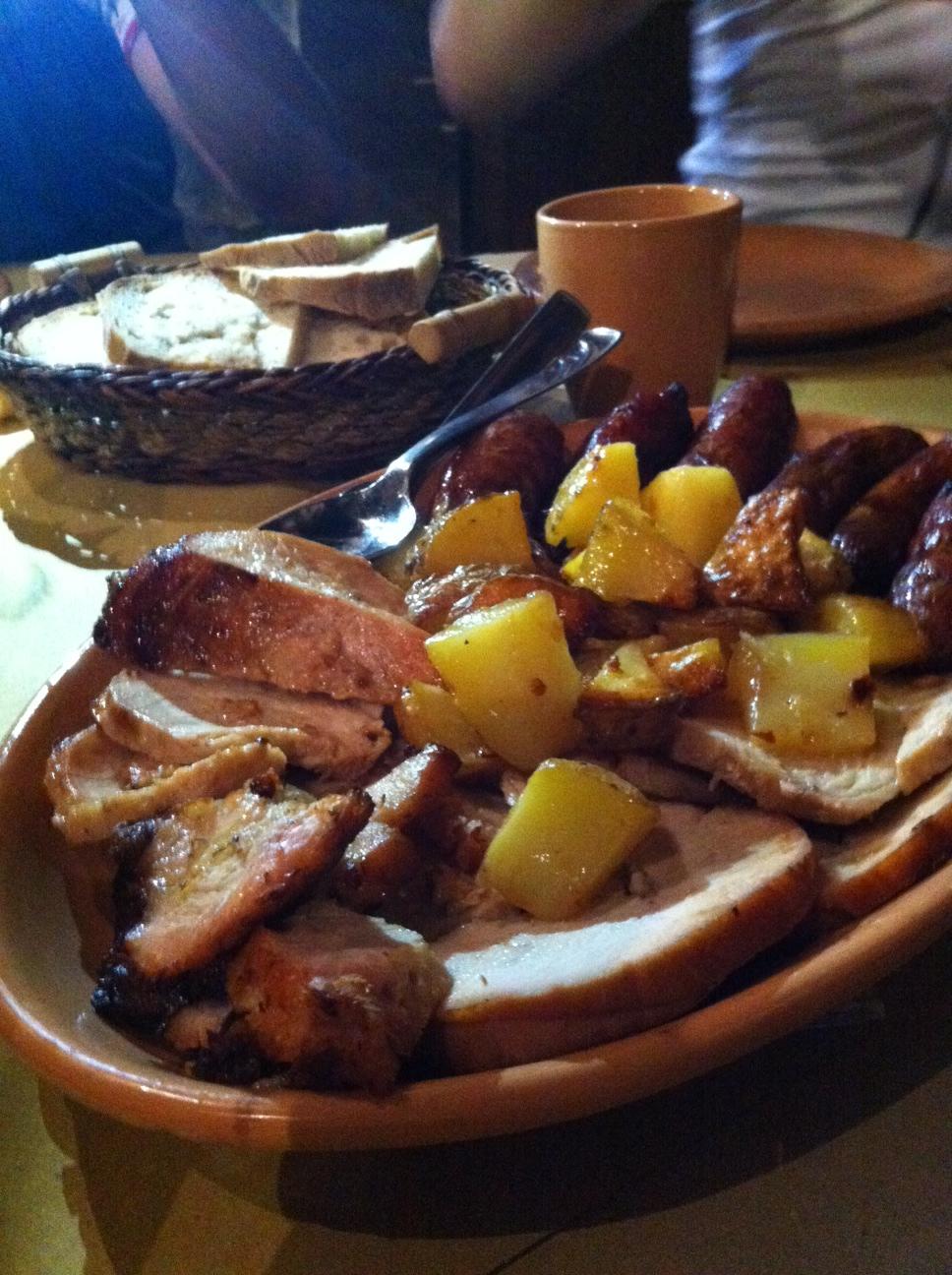 Mietimme jo luovuttamista, mutta tarjoilijatar kantoi pian eteemme tarjottimen täynnä grillattua kalkkunaa ja salsiccia-makkaraa sekä paahdettuja perunoita ja vihersalaattia. Emme voineet jättää lounasta kesken, vaikka järki sanoi, että ei tässä mitään järkeä ole! Vatsa oli eri mieltä, joten ääntä kohti vain!