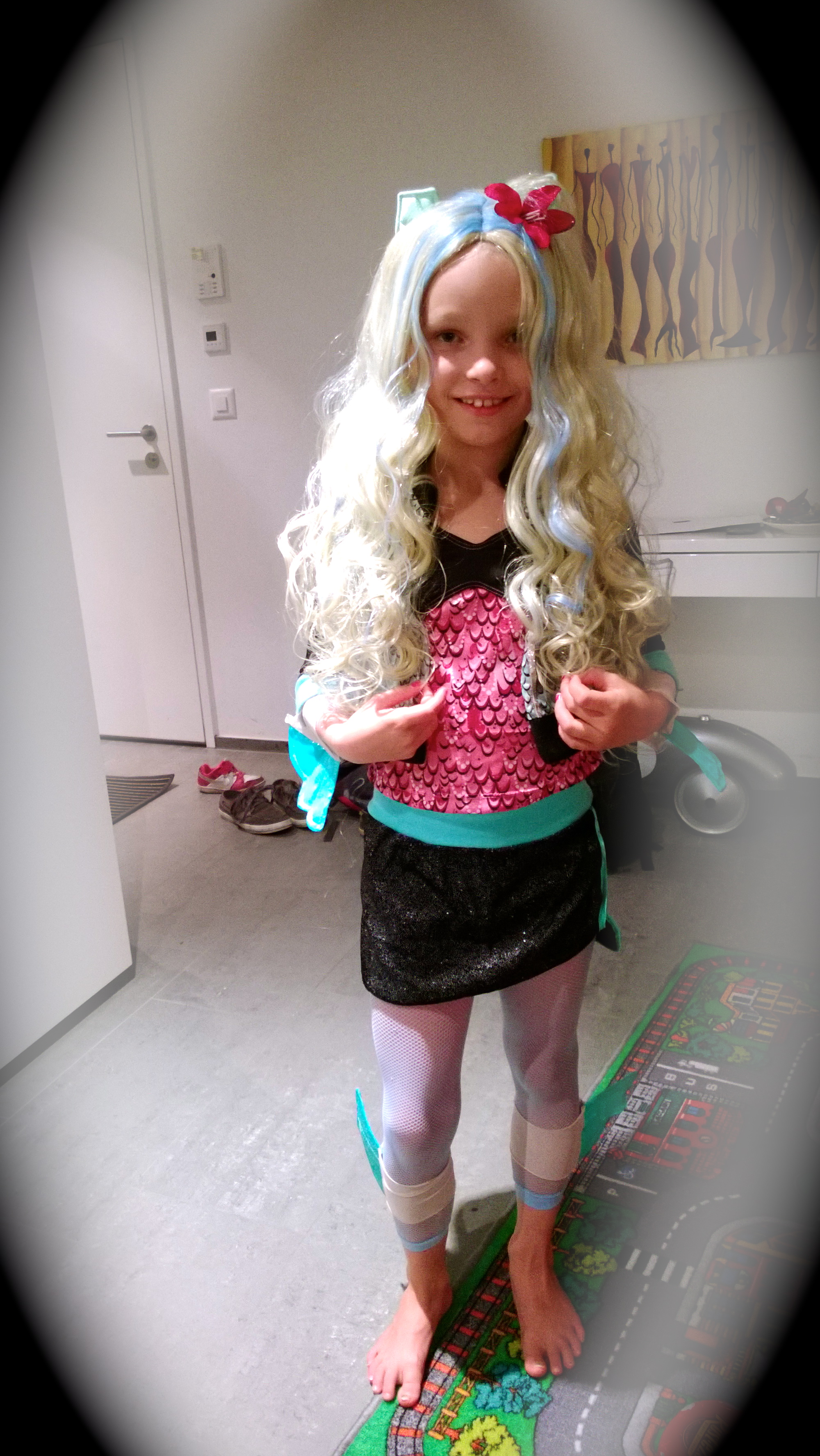 Lapset ja au pair ovat askarrelleet lepakko-, pääkallo- ja hämähäkkikoristeita jo muutaman viikona ja Julia toivoi joulukuisen syntymäpäivälahjansa jo etukäteen. Kävimme ostamassa himoitun MonsterHigh -naamiaisasun pari viikkoa sitten ja siitä saakka sitä on pidetty sängyn vieressä tätä iltaa odottaen. Kurpitsapääkin on kaiverrettu!