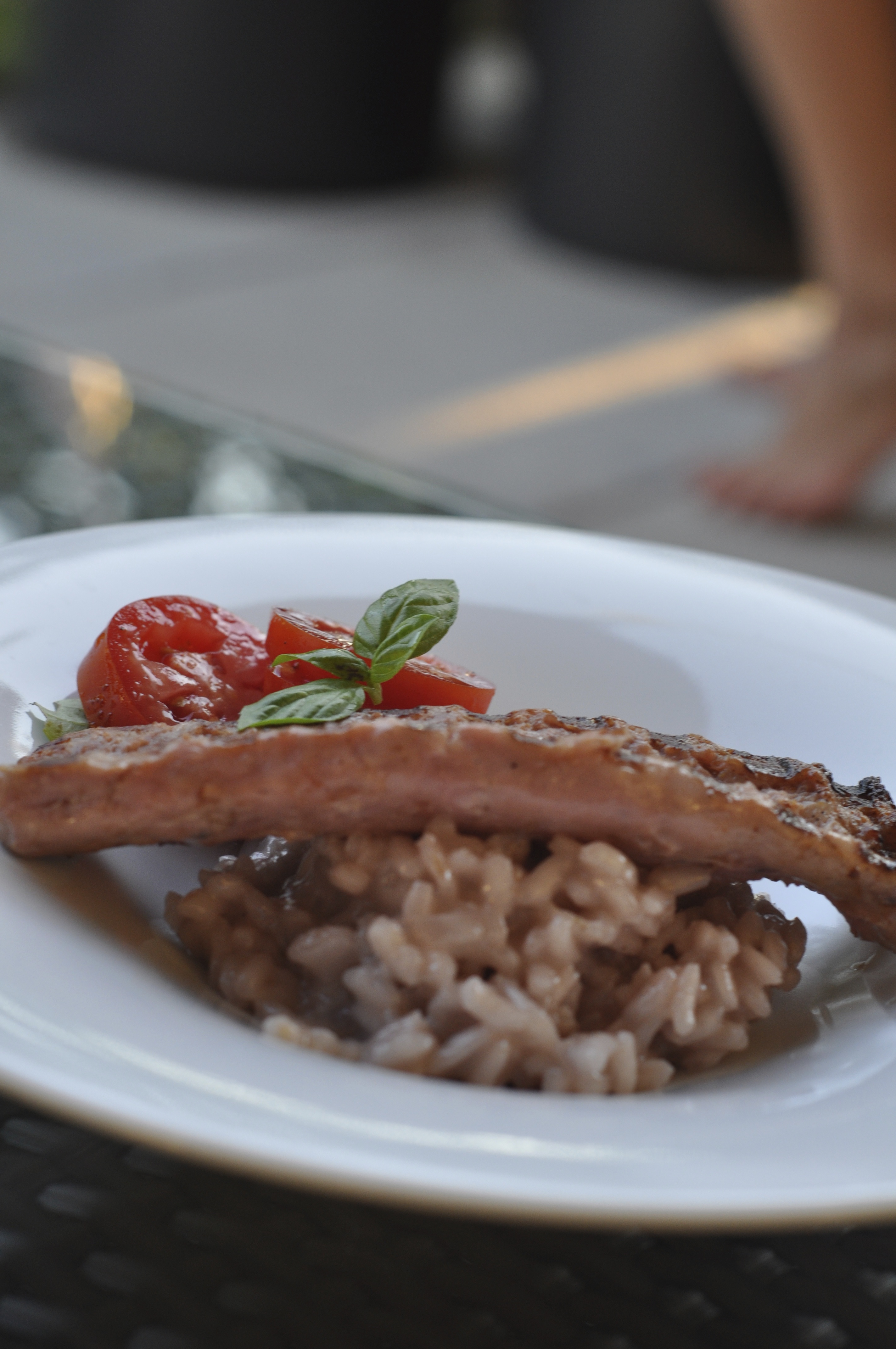 Avonaisena grillattua raakamakkaraa ja mustatorvirisottoa