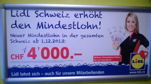 No, perspektiiviä asiaan antaa yleinen palkkataso. Lidl mainostaa junissa nostaneensa minimipalkkaansa. Halvinkin myyjä tienaa jatkossa vähintään 4000 frangia (n. 3200 euroa). Siis Lidlin kassalla. Lain mennessä läpi saisi Lidlin toimari palkkaa vaivaiset 48 000 frangia. Kuukaudessa.