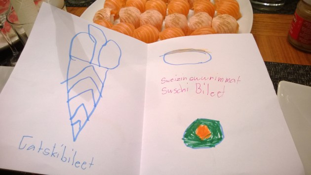 Isommat sisarukset ymmärsivät tilanteen ja askartelivat Albertille upean kutsun ”Sveitsin suurimpiin sushi- ja jätskibileisiin.”
