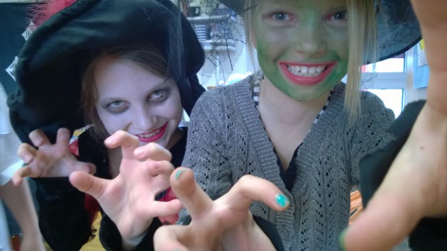 Aamu alkoi 9.15 pelottavassa, pimeässä luokassa noitien ulvontaa kuunnellessa. Tokaluokkalaiset olivat täysin itse järjestäneet Hexenfestit, eli noitakarkelot perheille. Olihan karnevaaliaika.
