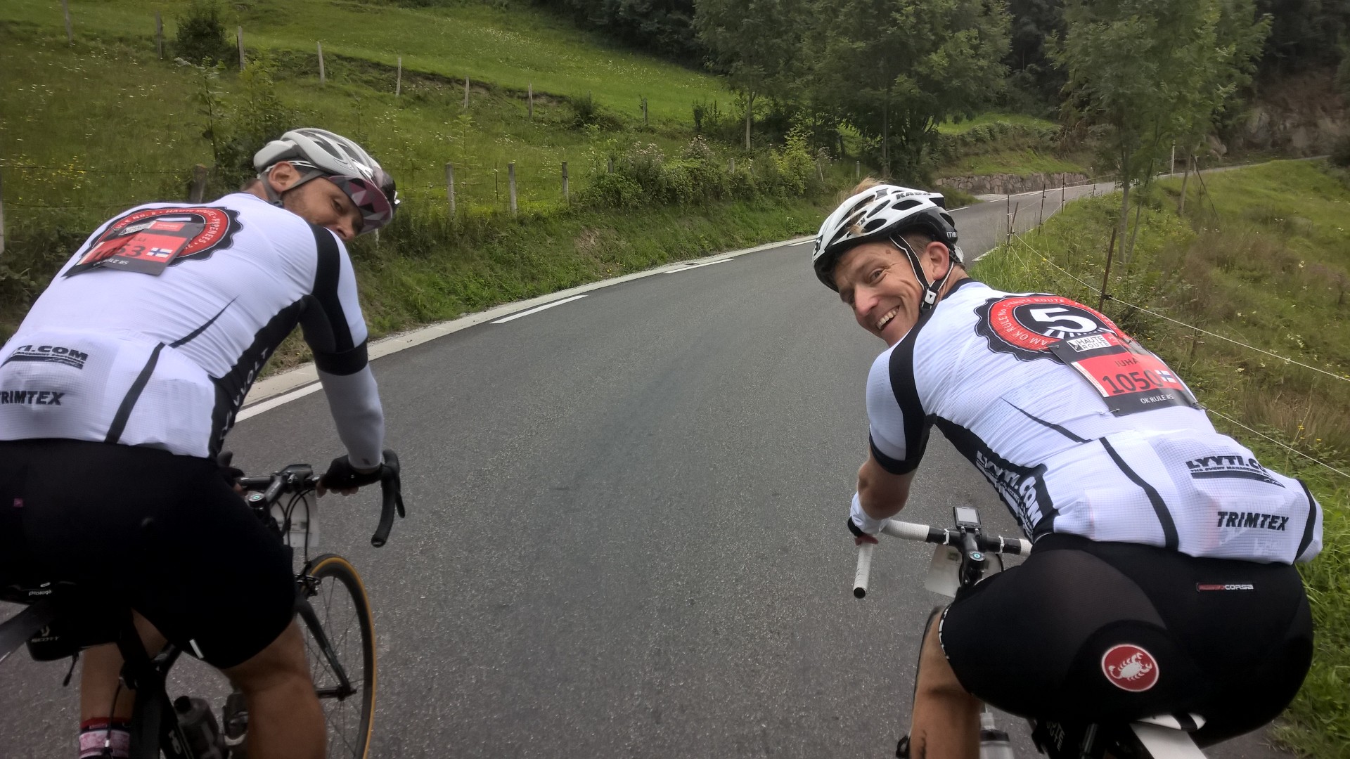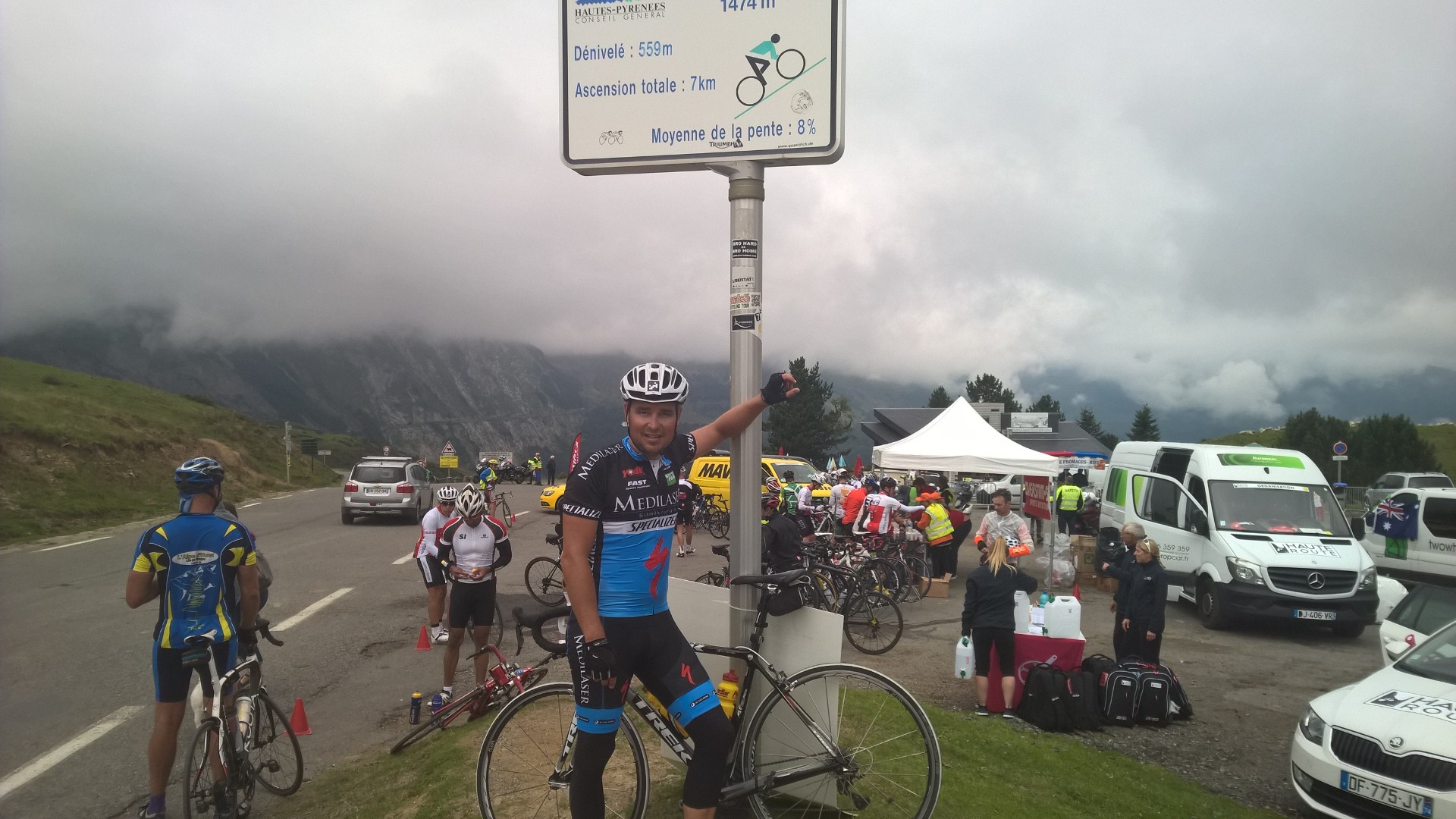 Hautacam (1520 metriä korkea, 13,3 km pitkä ja 1194 metriä korkeuseroa) oli vaativampi kuin edellinen nousu. Keskijyrkkyys on 8,2%, mutta jälleen oli useita pätkiä, joissa Garmin näytti jyrkkyydeksi jopa 14%. Poljimme jälleen Jussin ja Ollin kanssa kimpassa. Seurassamme viihtyi myös jo viime vuoden HR:lta tuttu Jamie Kanadasta. Poppi pauhaa porukassamme aina ylämäessä ja olemmekin keränneet harrastuksellamme jo lähes legendaarisen maineen ajajien keskuudessa. Lähdössä jo kysellään, että mitä tänään ylämäessä soi.