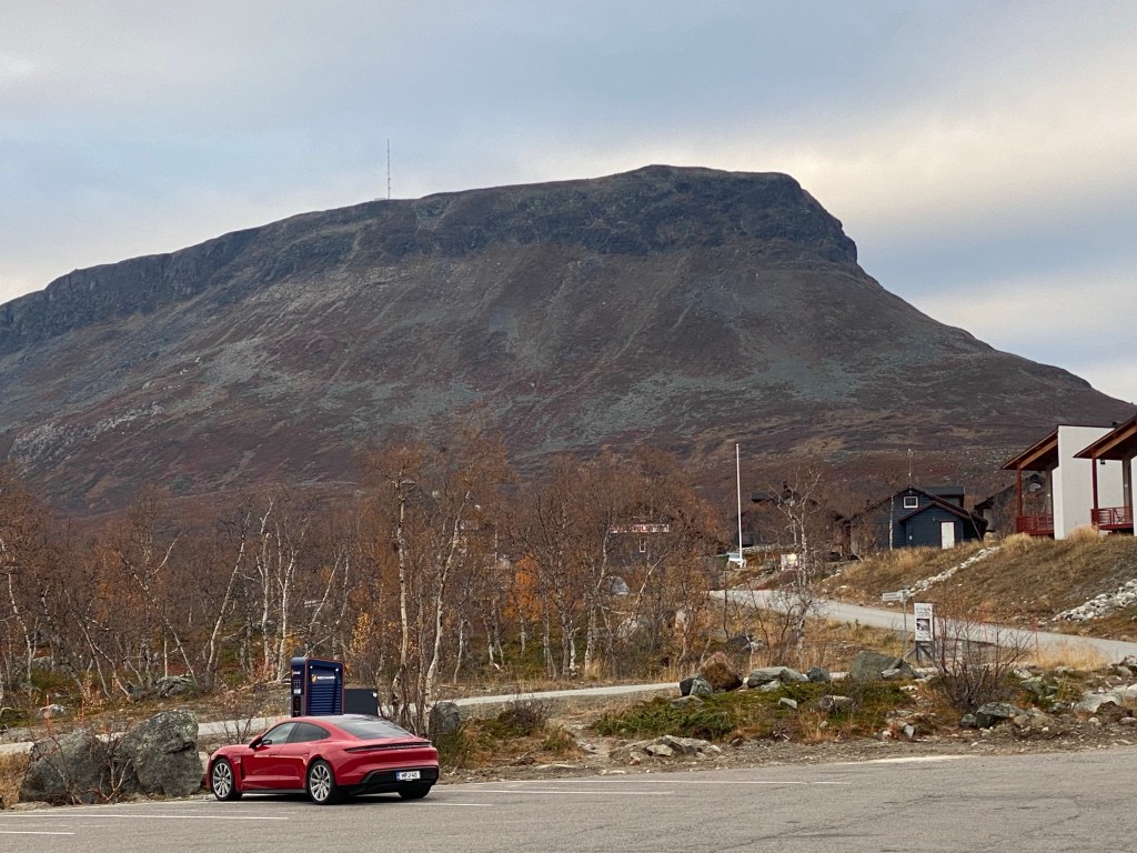 Kilpisjärvellä, Saanatunturin juurella, pääsin testaamaan tuoretta 175 kw pikalaturia. Sähköä Taycan otti tästä 80 kw tahdilla, vaikka oli ainoa auto kiinni laturissa. En tiedä, mikä selitti latauksen hitautta. Vessatauko ja pikainen eväiden täydennys kaupasta kesti parikymmentä minuuttia ja virtaa oli autoon tullut silti enemmän kuin riittävästi. Stromssaan pääsisi tästä ilman taukoja.