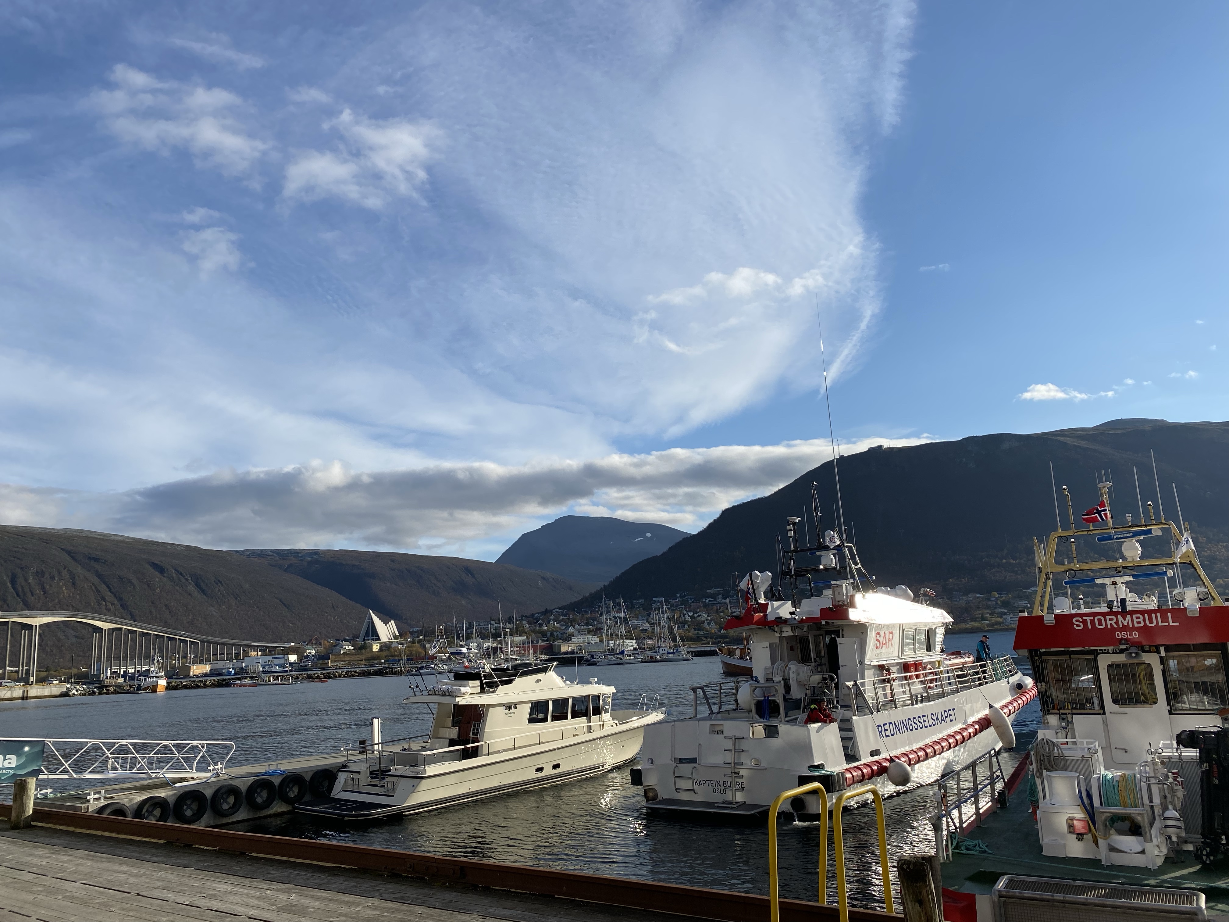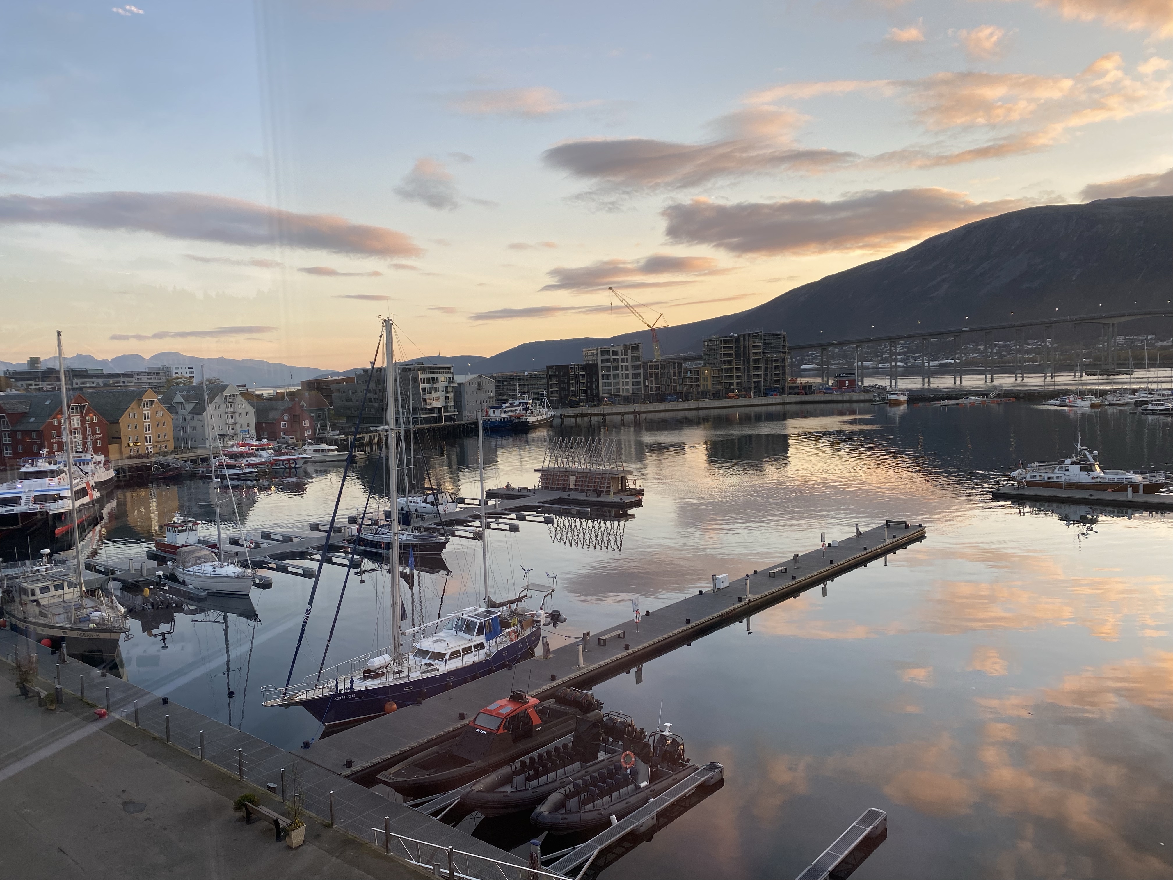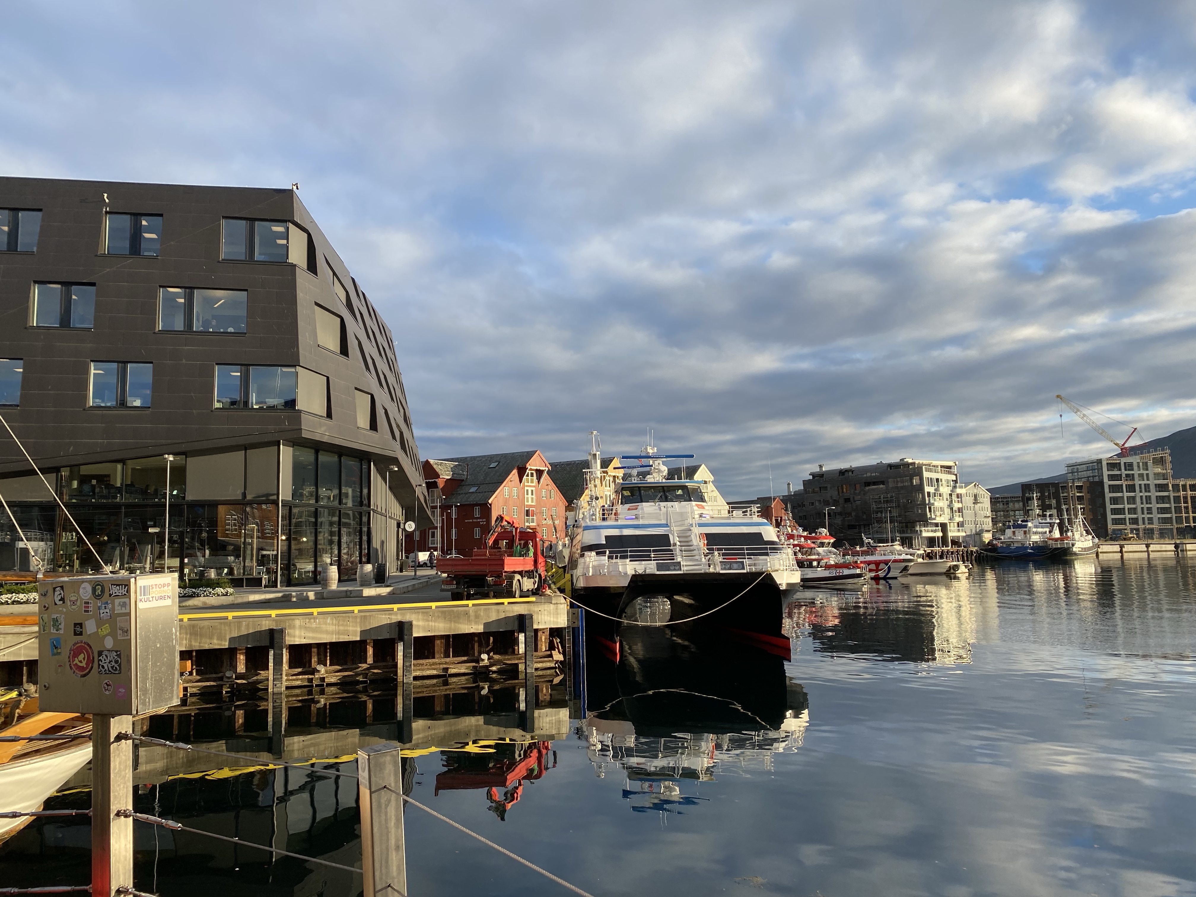 Tie vei Tromssaan, johon saavuimme pimeän jo laskeuduttua. Kaupunki näytti iltavalaistuksessaan maagiselta. Vuonomaisemista saimme nauttia hieman jo matkalla, mutta varsinaisesti niihin oli tarkoitus perehtyä Hurtigruten-laivan kyydissä seuraavana päivänä.
