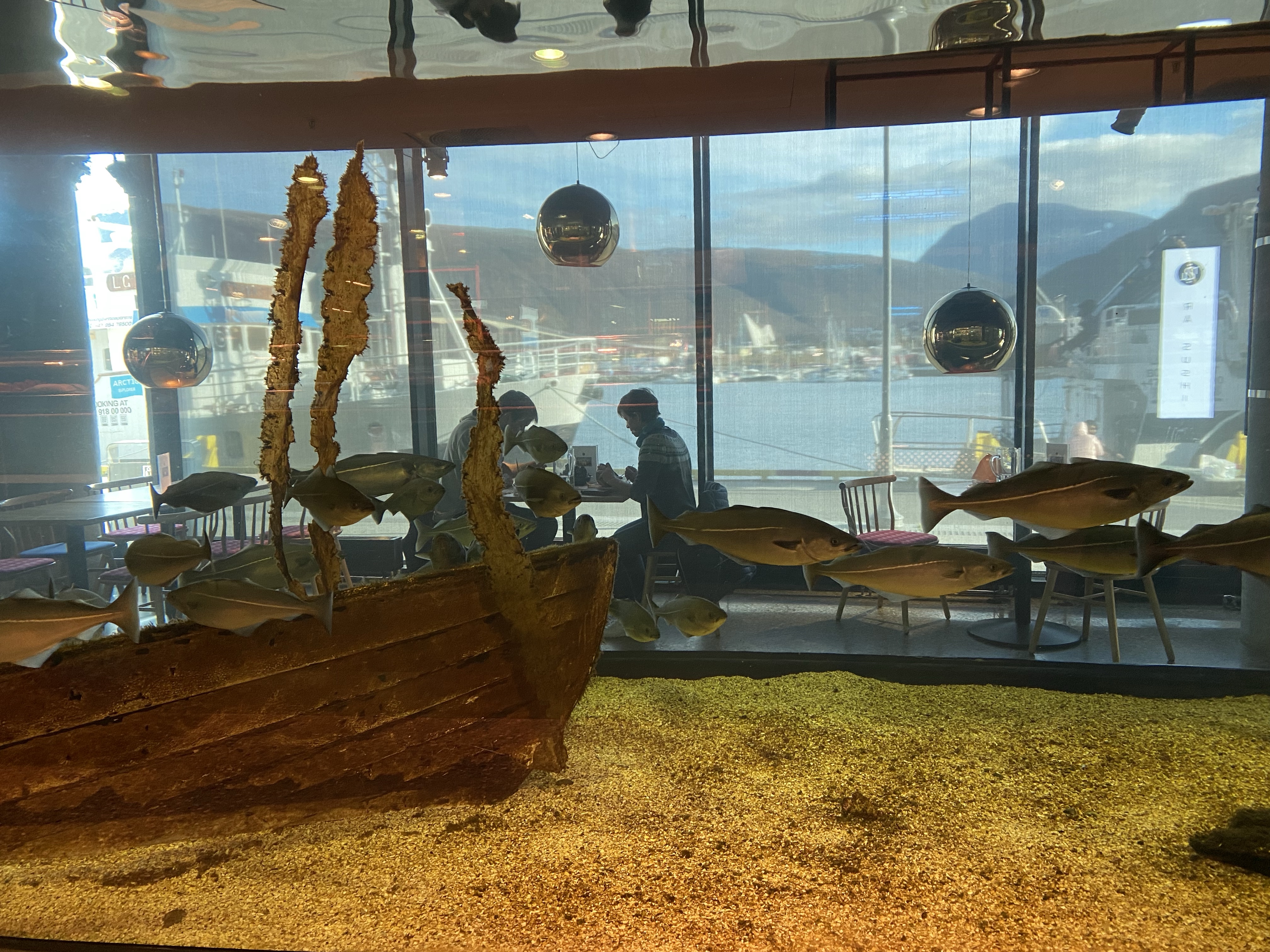 Majoituimme Clarionin Aurora-hotellissa aivan meren rannalla. Hotelli on aika perustasoinen, vaikkakin listattu neljäksi tähdeksi. Hintaan kuului puolihoito, mutta katsastettuamme illallistarjonnan (pastaa, lihapullia ja pari erilaista salaattia buffasta), totesimme, että emme ajaneet Pohjois-Norjaan syömään pastaa buffasta ruokalamaisessa miljöössä. Niinpä suuntasimme viereiseen Fiskekompaniet-ravintolaan.