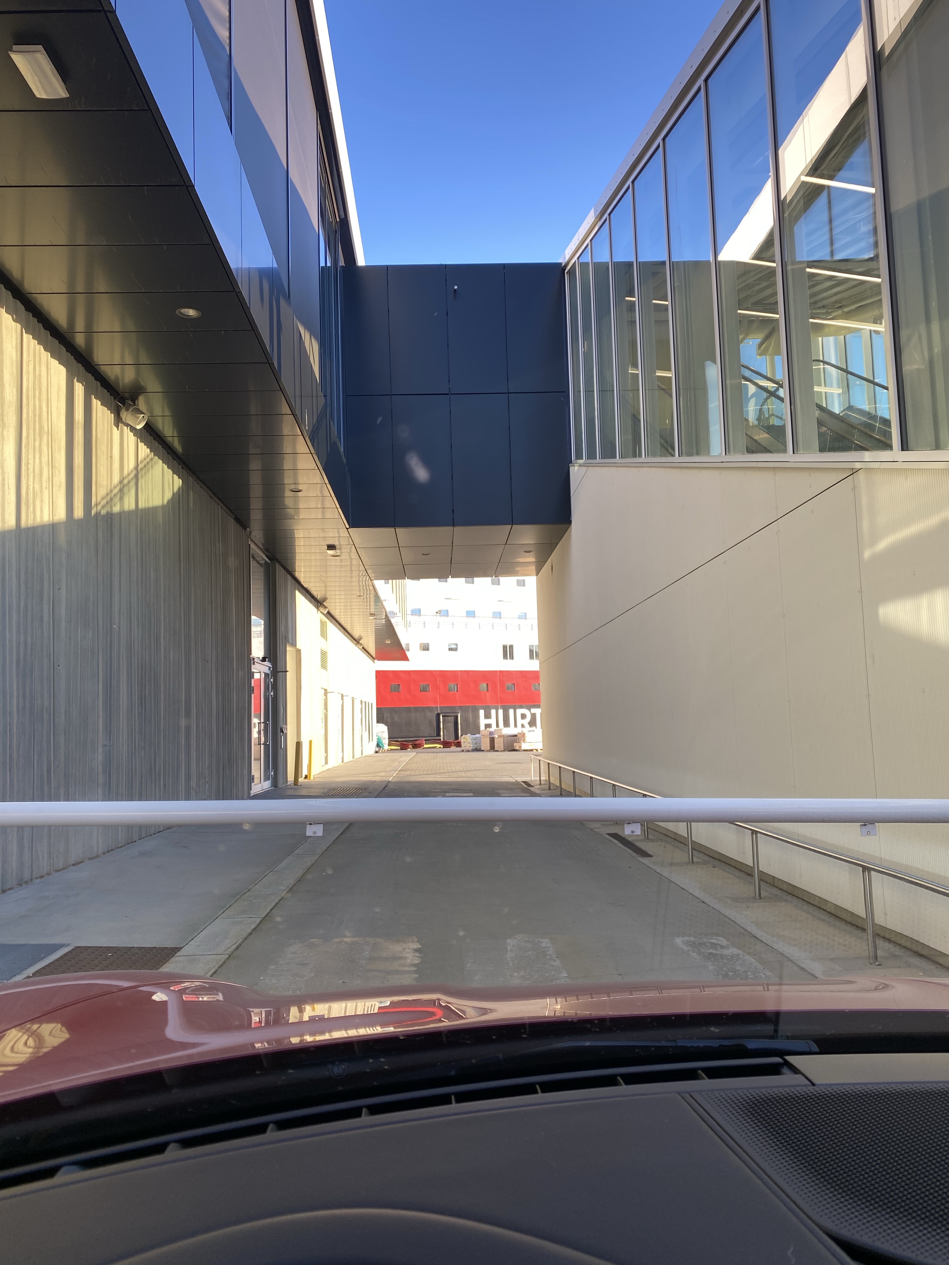 Laivaan siis ajetaan laivan keulan puolelta, pienestä portista ja vaikka näyttää siltä, että ajat jonnekin lastauslaiturille, jossa rekat ja trukit hääräävät ja tunnet, että sinun ei kuuluisi olla täällä, niin olet aivan oikeassa paikassa.
