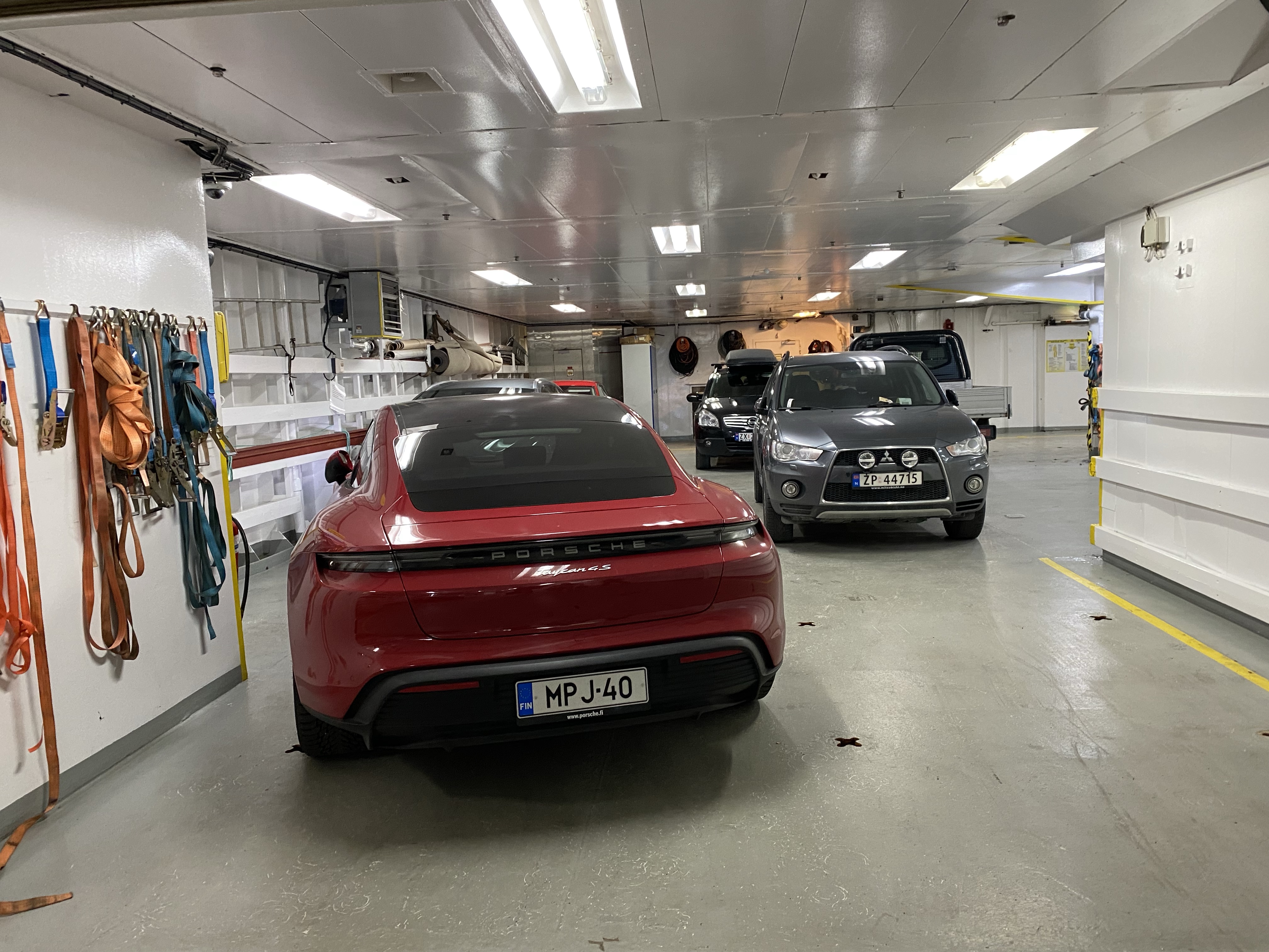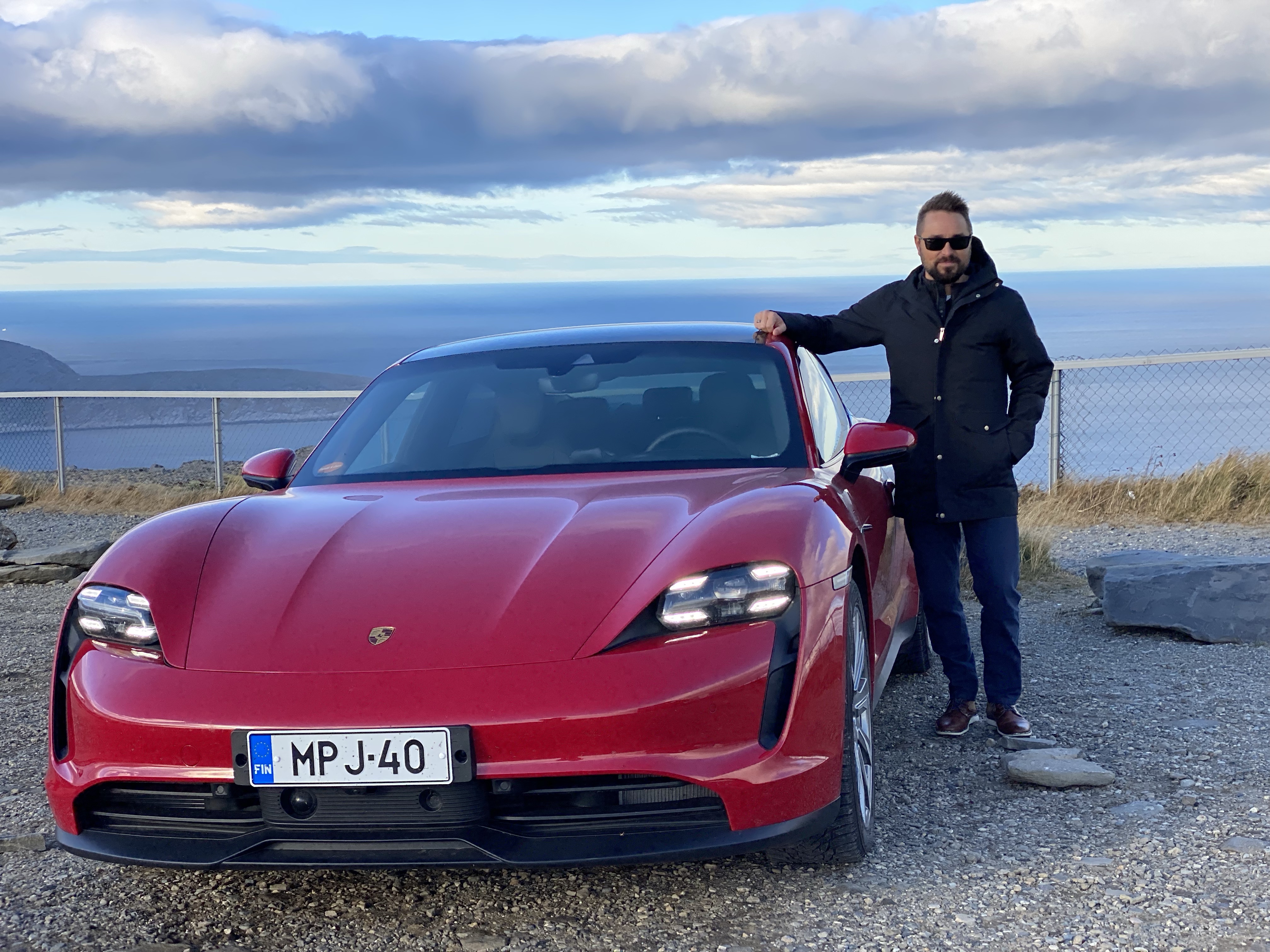 Autona alla oli Porsche Taycan ja majoitus sekä junassa (kaksi yötä), hotellissa, laivassa että huskytilalla.