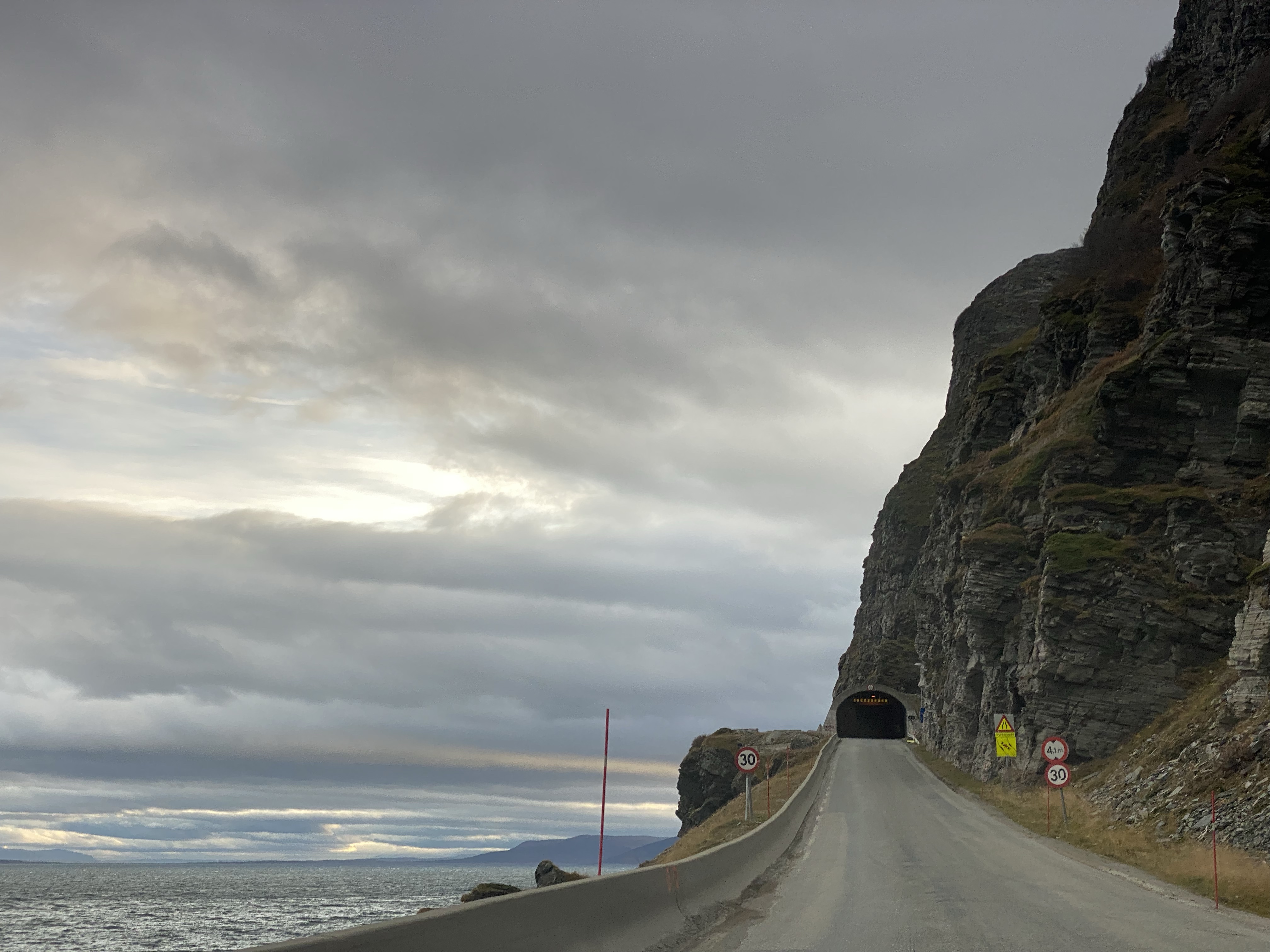 Honningsvågin satamasta matkaa Nordkappiin on noin 35 kilometriä ja tie mutkittelee ensiksi serpentiinitienä ylös vuorta, sitten se menee kuumaisessa maisemassa ylängöllä, laskee välillä meren rantaan ja nousee taas Nordkappin niemelle. Henkeäsalpaavaa. Tänne haluan joskus pyöräilemään! Nautin toki täysin siemauksin myös autolla kruisailusta. Sähkö-Porsche pääsee oikeuksiinsa mutkaisella tiellä, jossa jarrua ja kaasua tulee käytettyä paljon.