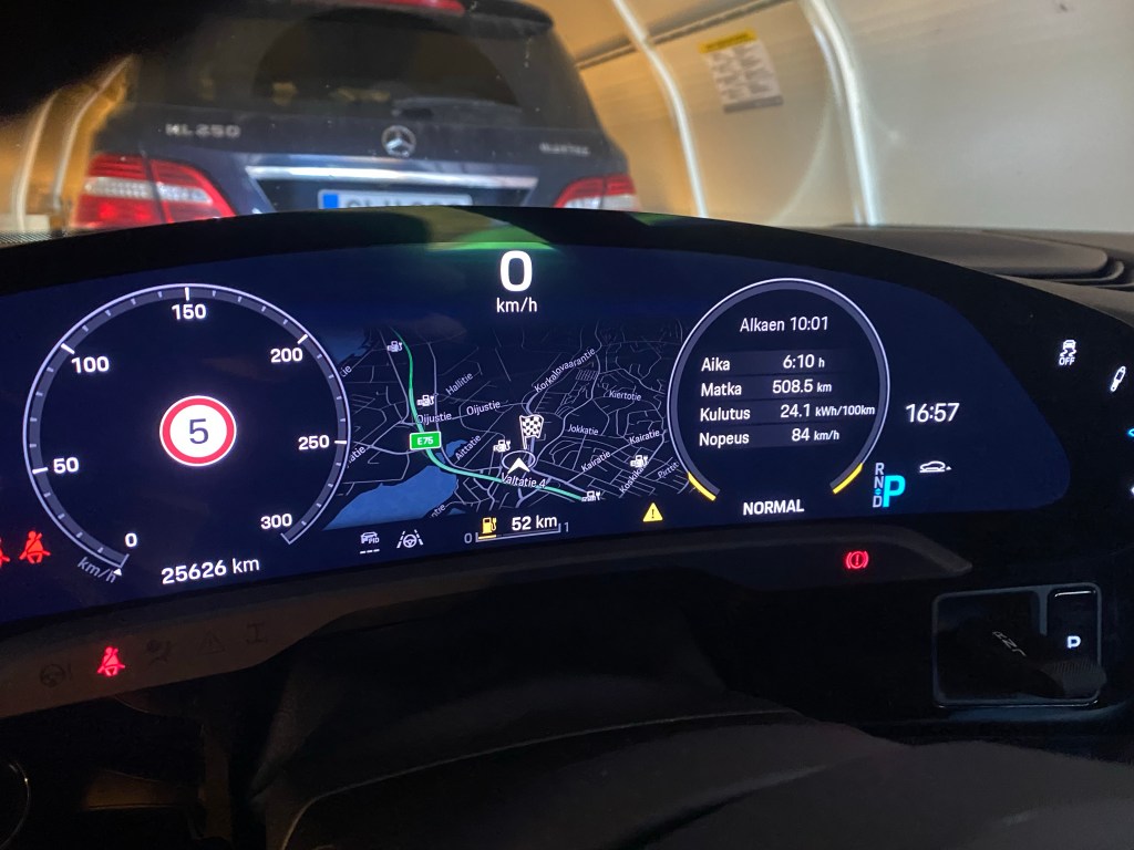 Junaan ajoin 16:57 viimeisenä autona. Akkua jäi vielä 52 kilometriin, joten meille jäi ruhtinaallinen kolmen minuutin virhemarginaali yli 500 kilometrin matkalla…