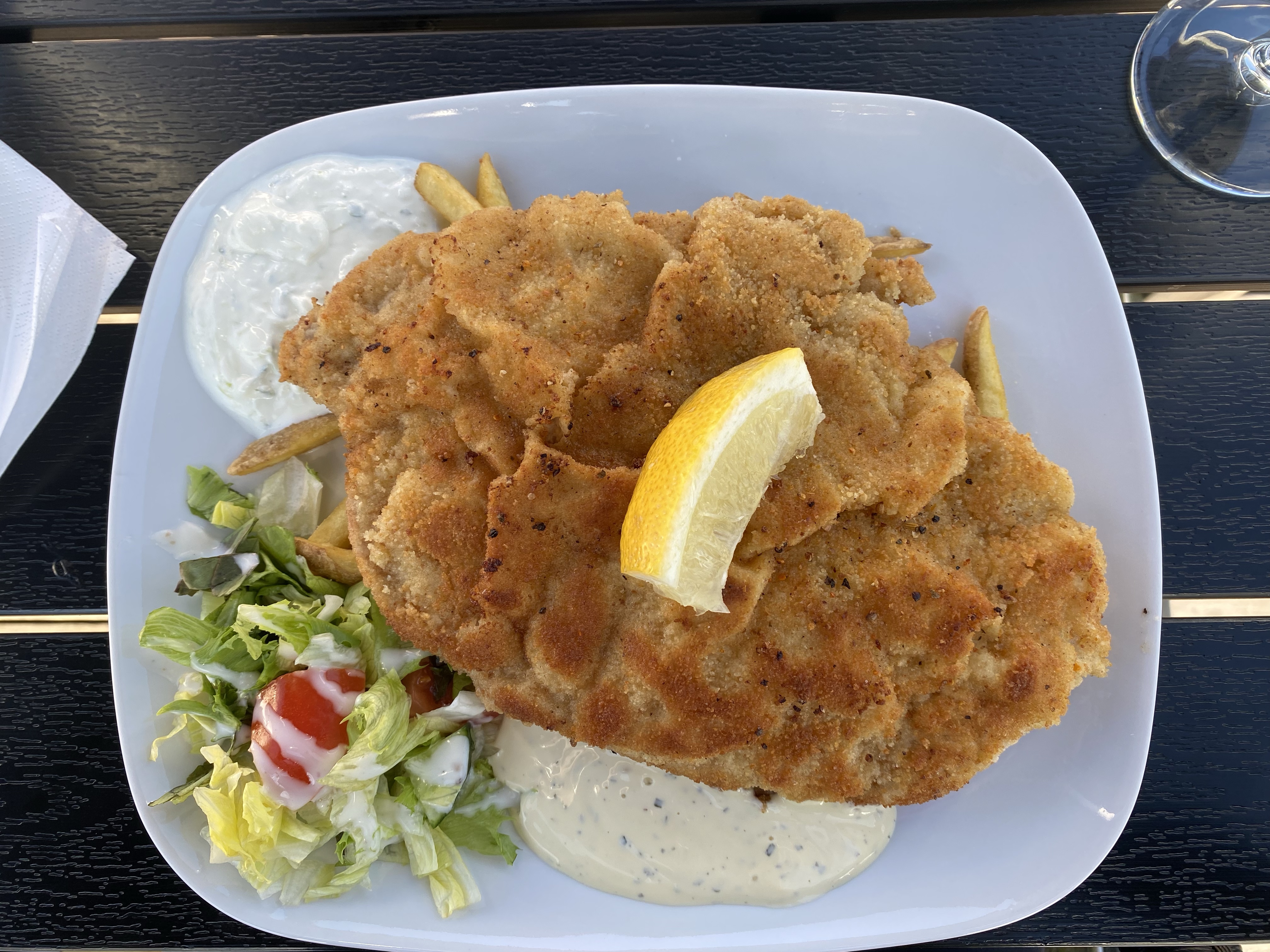 Suuntasimme välittömästi ravintolaan. Yhdessä sataman myyntikojussa myytiin onneksemme kalaa ja päätimmekin muuttaa seuraavan päivän menua pastasta fisuun. Ravintolan erikoisuus on schnitzel, joka piti taas testata. Olihan se hyvä!