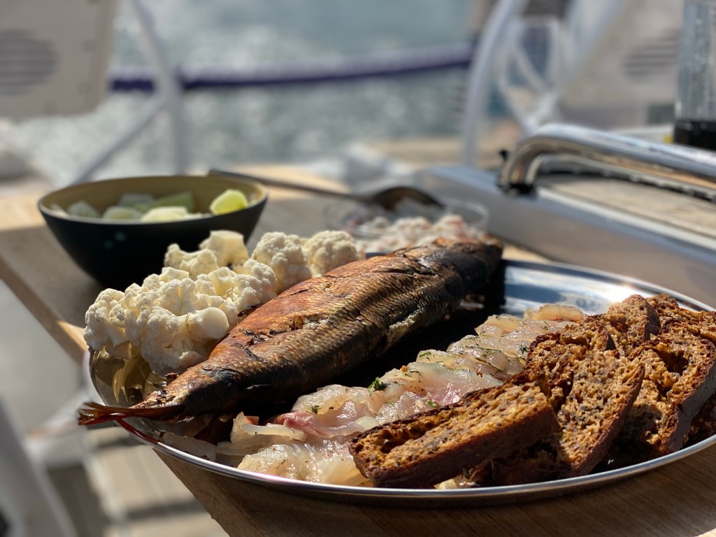 Kihdille päästyämme tuuli pysyi tasaisena 8-9 m/s ja suorastaan lensimme aukon yli. Tein siitä myös videon. Aallot olivat sitä luokkaa, että olimme iloisia siitä, ettei epälaivakoiramme Miisa ollut matkassa mukana. Tai vaimo 😉 Julia puolestaan nautti vauhdista (sekä vene että tytär) ja kokkasipa hän meille herkulliset hodaritkin tuossa merenkäynnissä. Kuivatut sipulit eivät oikein tahtoneet pysyä kyydissä tuulessa.