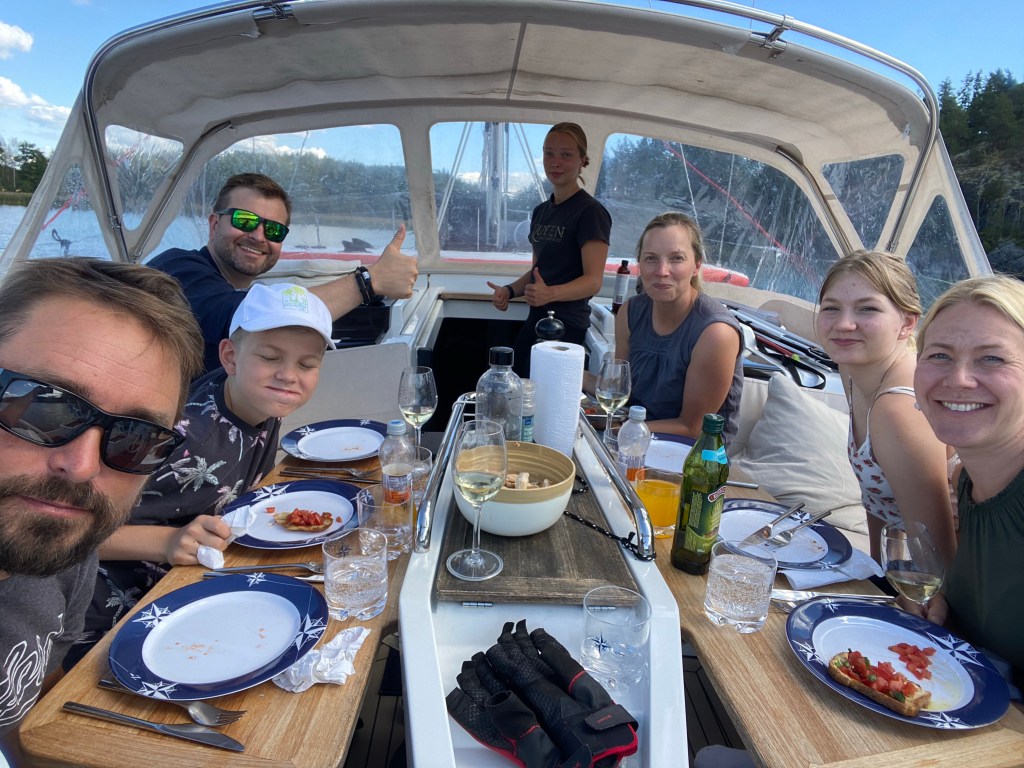 Hyppeisistä oli edessä viikon viimeinen legi kohti kotisatamaa. Pläkässä matka alkoi ja puolivälissä saimme purjeetkin ylös. Kesken matkan meille oli luvassa miehistönvaihdos, sillä ystämme Sveitsistä olivat maisemissa. Sumplimme heille meripäivän siten, että he hyppäsivät vaimoni kyytiin Kaarinassa, josta siirtyivät Airistolle. Siellä siirryttiin moottoriveneeseen, jolla vaimo ajoi heidät sovittuun lounaspaikkaan Torasvikenin pohjukkaan. Me suuntasimme sinne purjeveneellä ja vaikka kauppa ja merenkulku on arvaamatonta, olimme molemmat veneet siellä muutaman minuutin erolla toisistamme. Ankkuri mereen, vieraat kyytiin, piknik pystyyn ja nauttimaan kesästä. Pienen tauon jälkeen vaimo nappasi förstini, eli tyttäremme, kyytiin ja lähti viemään häntä treeneihin. Me puolestaan purjehdimme veneen kotisatamaan.