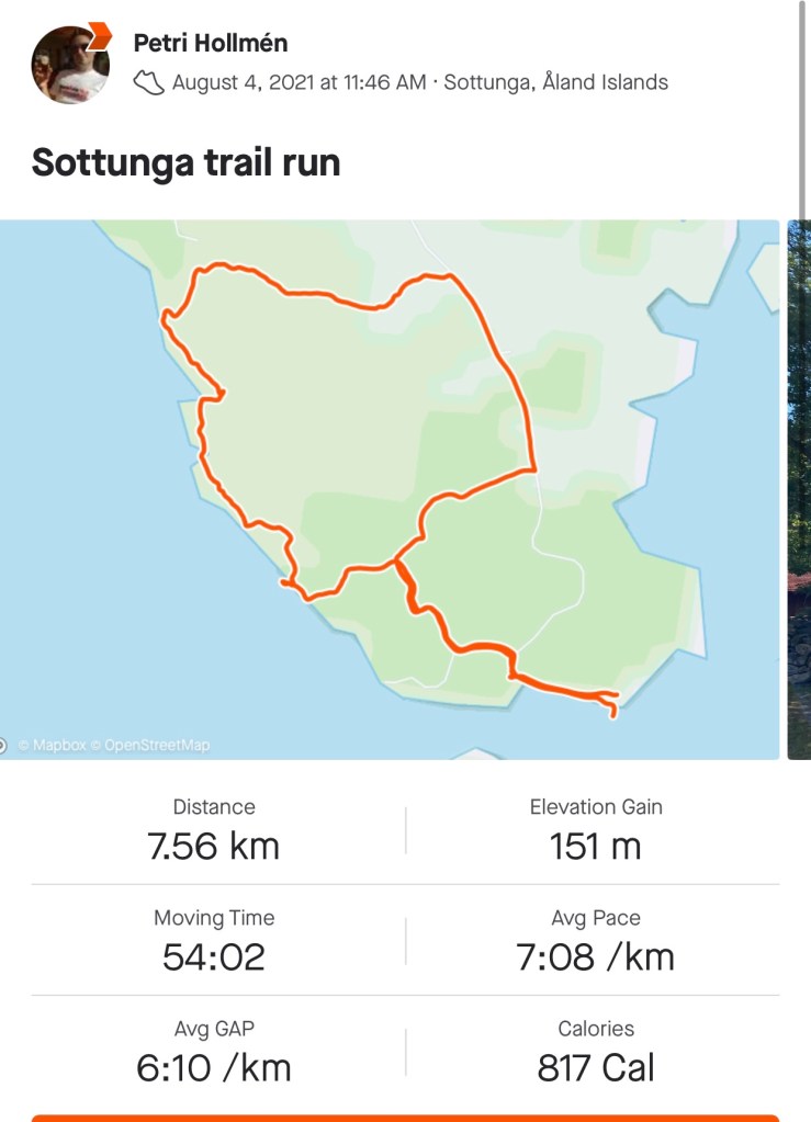 Sottungan vierasvenesatamasta lähtee siis Pyhän Olavin pyhiinvaellusreitin polut. Reittiä pitkin vaellettiin kuulemma jo keskiajalla Norjaan pyhiinvaellushengessä. Kartassa näkyy vain kolmen kilometrin vaihtoehto, mutta maastossa on kyltit myös kahdeksalle kilometrille. Päätimme juosta sen aamulenkkinä. Reitti on kaunis ja hyvin merkattu. Sitä juostessa ihmettelimme toki, että miksi ne pyhiinvaeltajat päättivät heittää Sottungassa ylimääräisen ympyrän matkalla Norjaan.