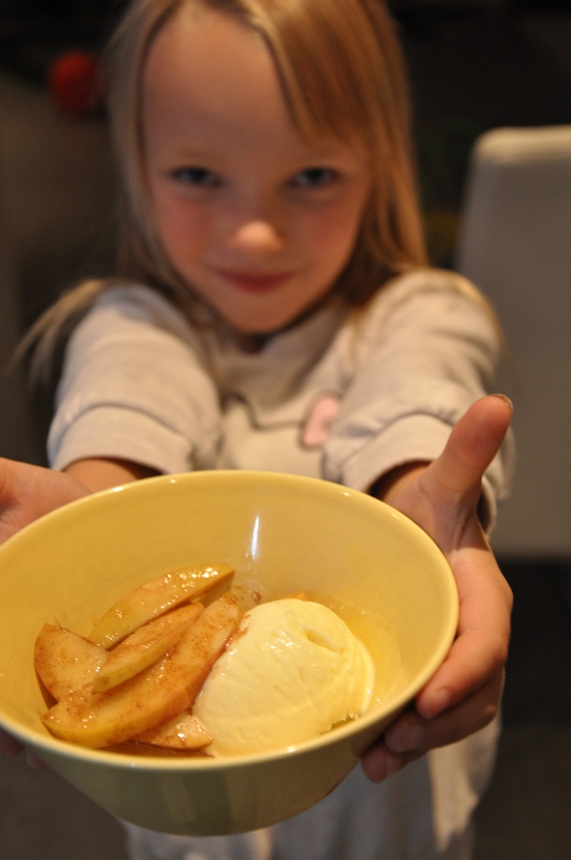 Laita pannulle voita ja kuumenna. Paista omenasiivuja voissa, kunnes omenat hieman pehmenevät. Tarjoa heti vaniljajäätelön kera.