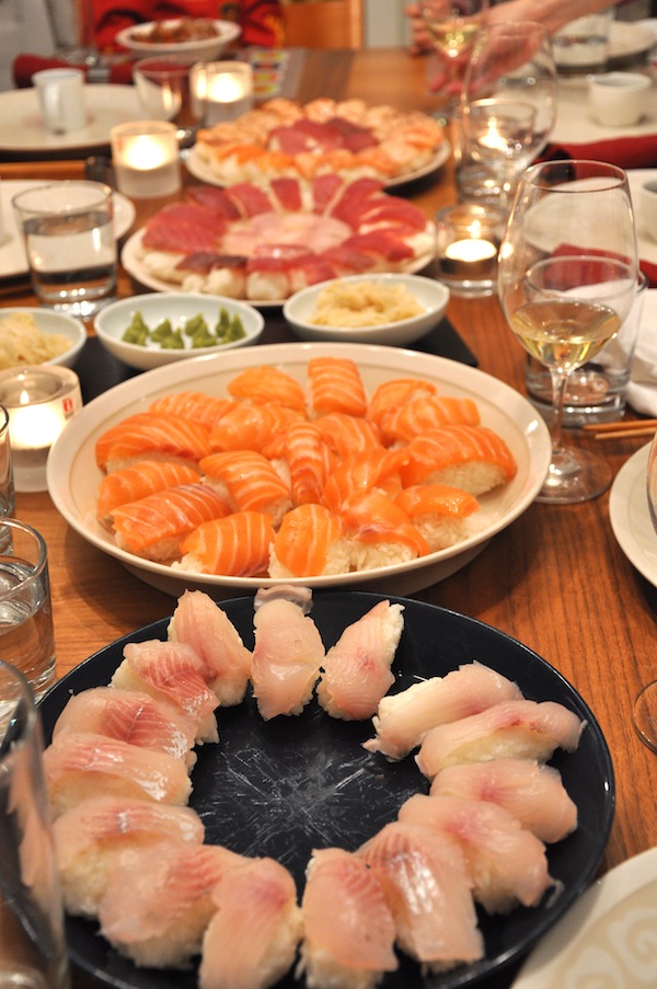 Viime perjantaina veljeskatraastani kolme kutsuttivat itsensä meille kylään siippoinen ja lapsineen. Mikäs sen parempi mahdollisuus tehdä hillittömät määrät sushia, kun tekijöitä riittää! Hain kalat Turun kauppahallista Herkkunuotasta (joka on mielestäni Kalapoikien ohella Turun parhaimpia kalakauppiaita) ja käytännön vinkit hallin Kado Sushista. Ostin sieltä myös soijan ja riisiviinietikkaseoksen, koska se vain on erittäin hyvää. Samalla sain valmistusvinkit mm. riisin keittoon.