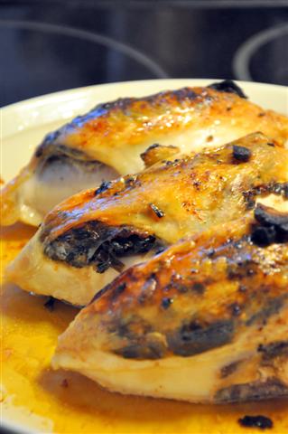 Kuumenna lopuksi vielä kastike ja nostele sitä lusikalla siivuiksi leikattujen kanafileiden päälle. Tarjoa salaatin ja uunissa valmistettujen lohkoperunoiden kera.