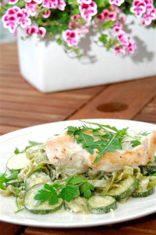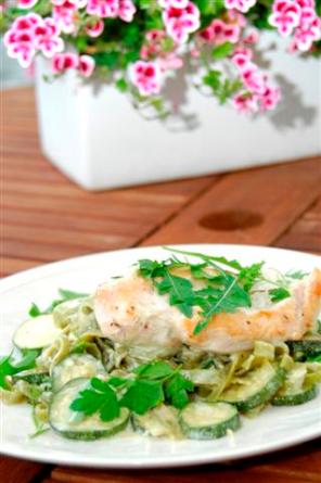 Lämmitä iso kattilallinen vettä kiehuvaksi ja mausta se suolalla. Laita pasta kiehumaan, keitä ja jätä hieman raa’aksi sillä se menee vielä pannulle. Pilko sipulit. Siivuta kesäkurpitsat kolikoiksi. Paista kuumalla pannulla oliiviöljyssä sipuleita, kanoja ja kesäkurpitsoja siten, että kanat saavat väriä. Laske lämpötilaa ja lisää kerma pannulle. Mausta suolalla ja pippurilla. Anna hautua, kunnes kanat ovat kypsiä.