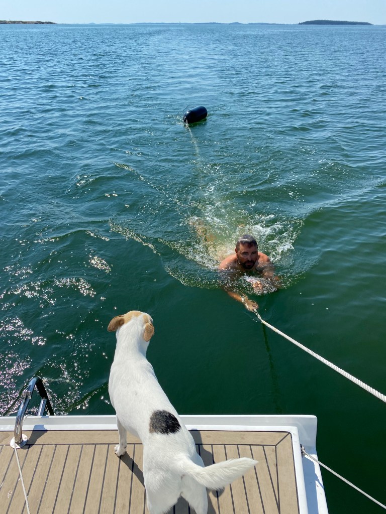 Noin kilometrin uinnin jälkeen huomasin, että veneemme kiihdyttää vauhtia ja loittonee aika kauas. Orpo olo iskee aika nopeasti, kun huomaa, ettei uimalla enää saa venettä kiinni. Ensiksi mietin, että unohtiko perhe, että isä puuttuu ja lähtivät ajamaan vauhdilla kotisatamaan. Kyllähän minä uida jaksan, mutta kymmenisen kilometriä kohtalaisen vilkkaalla väylällä voisi olla vähän liikaa. Kävi myös mielessä, että onkohan tämä vaimon tapa kertoa mielipiteensä harrastuksistani 🙂