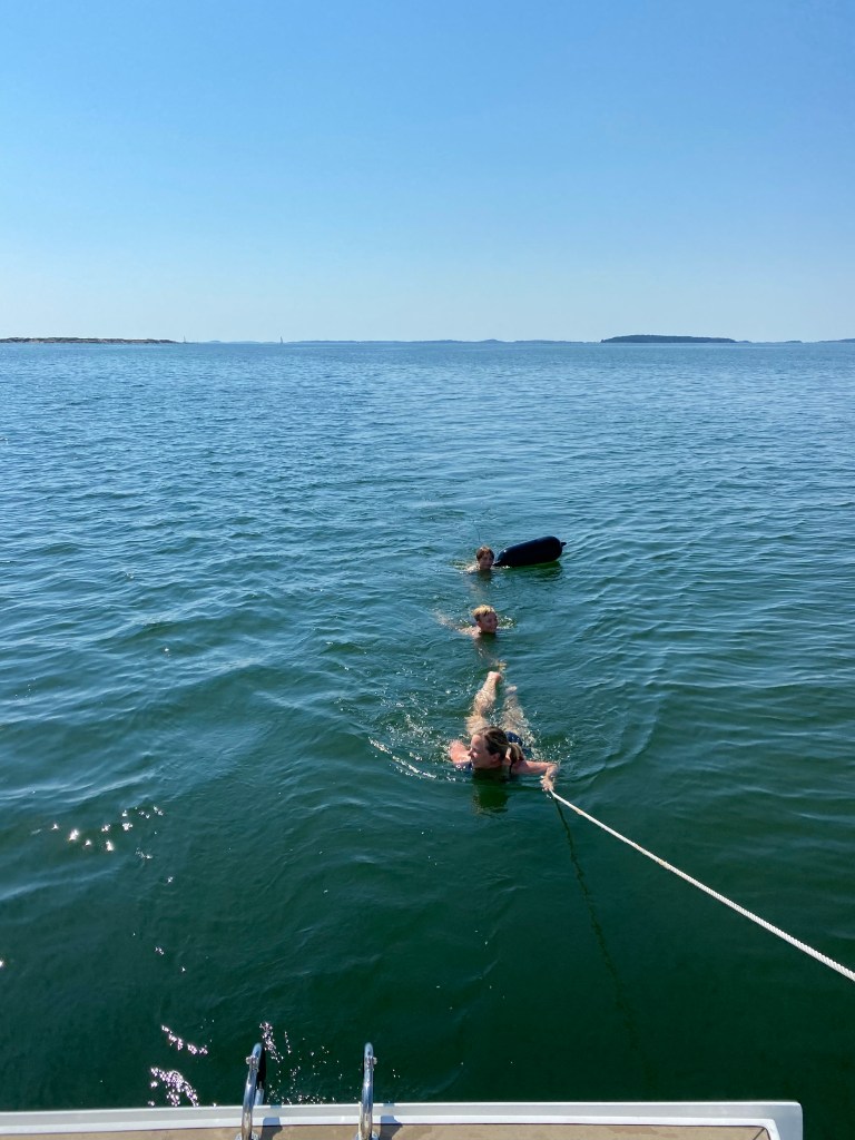 Tänään oli sellainen päivä, josta myös teini piti: Sandön edustalla laskimme taas veneen perään köyden, jonka päässä on fendari ja halukkaat saivat hyppiä uimaan.