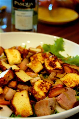 Munajuustoa jäi yli, joten seuraavana päivänä nautimme tätä hedelmäistä salaattia. Ruokakaupoista löytyy ainakin Kolatun munajuustoa, joka käy varsin hyvin grilliin ja salaattiin. Salaatit tulevat tietenkin Sorrilta (www.sorri.fi).