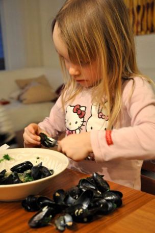 Julia kun raahasi (ihan totta, ylpeänä kantoi jääpatjalle pakattuja simpukoita kaupassa) kotiimme puolikiloa sinisimpukoita, niin pitihän niistä kokatakin. Tyttö itse istui lieden vieressä koko ajan, sekoitti, hämmensi, maustoi ja imi tietoa itseensä. Simpukoista tuli niin hyviä, että niitä teemme toistekin!
