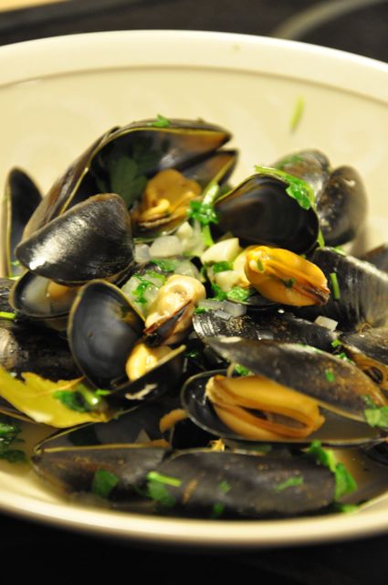 Pilko sipuli ja valkosipuli pieneksi. Sulata voi kattilassa, lisää sipulit ja paista pehmeäksi. Lisää viini, suola ja yrtit (paitsi persilja!). Pane simpukat kattilaan. Keitä kannella suljettuna voimakkaasti viitisen minuuttia ja sekoita simpukoita välillä. Kun simpukat ovat avautuneet, ruoka on valmista.