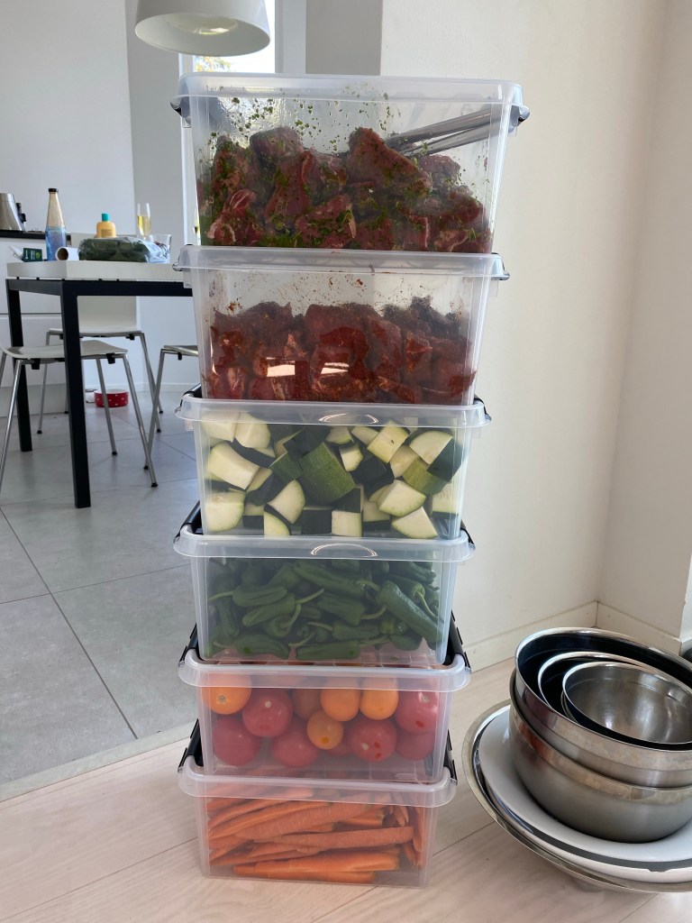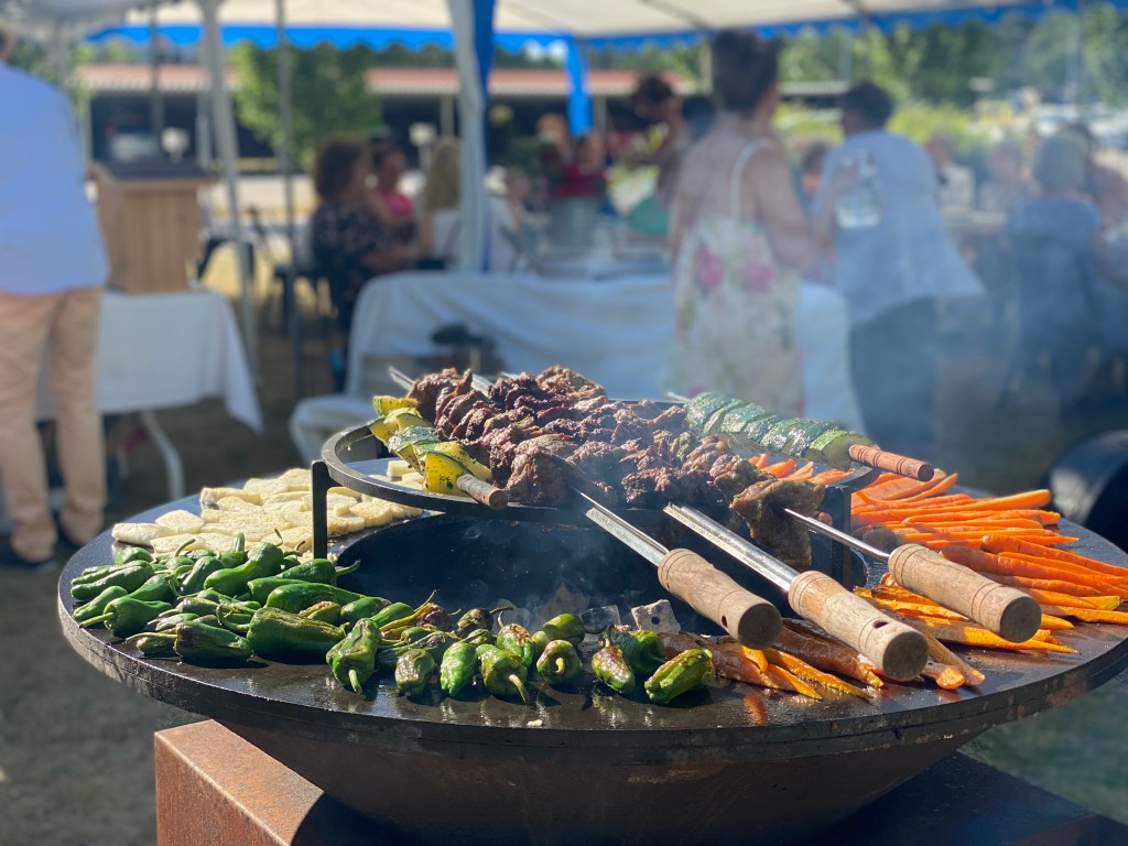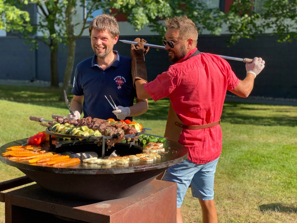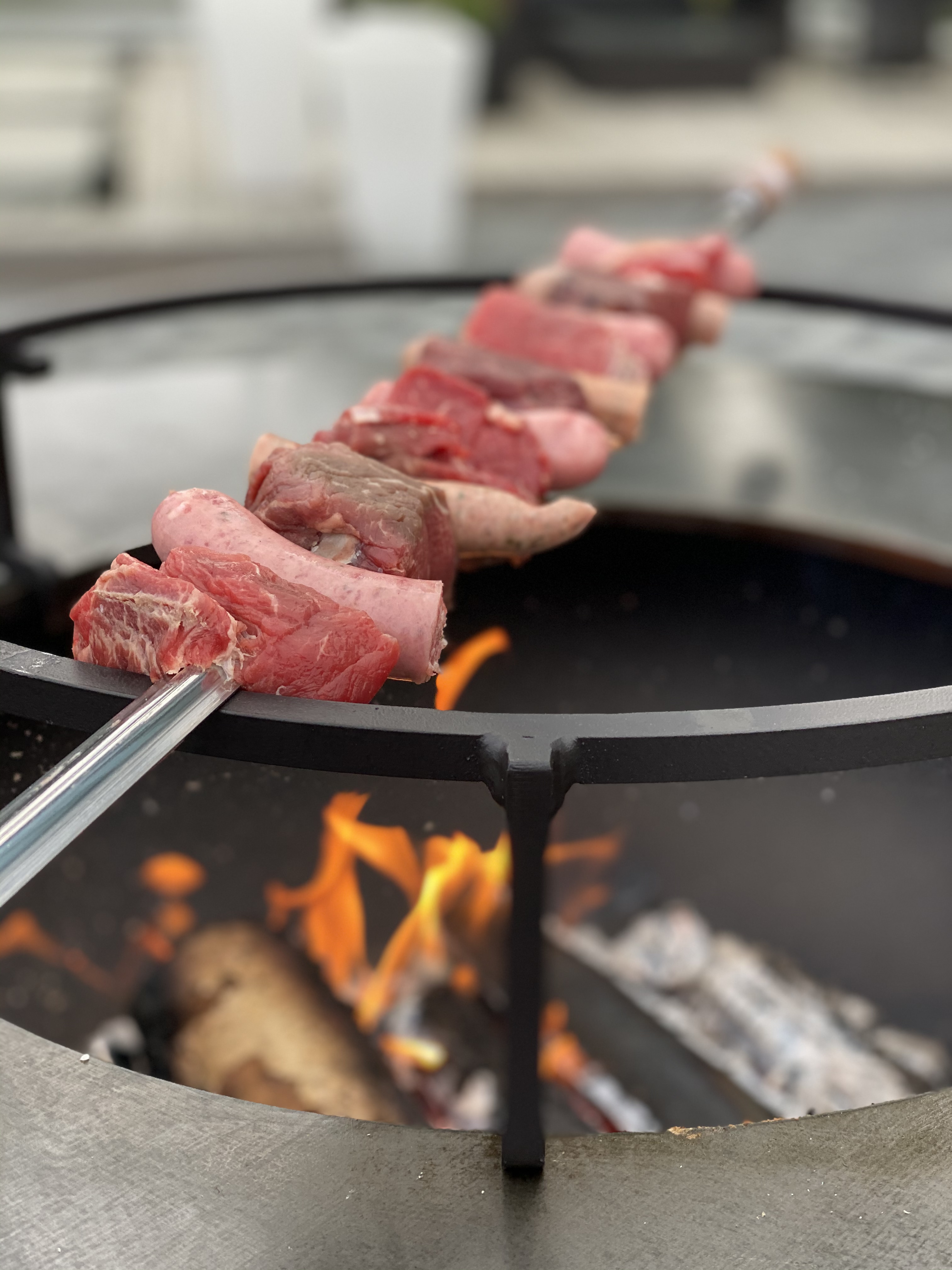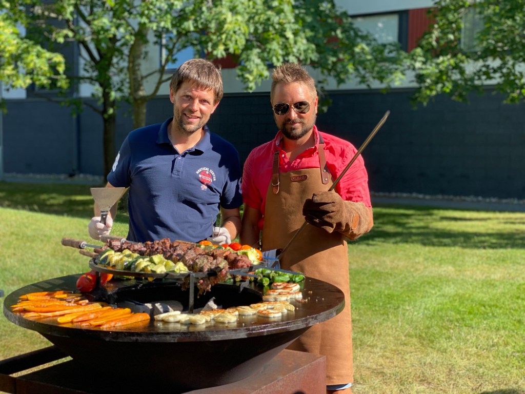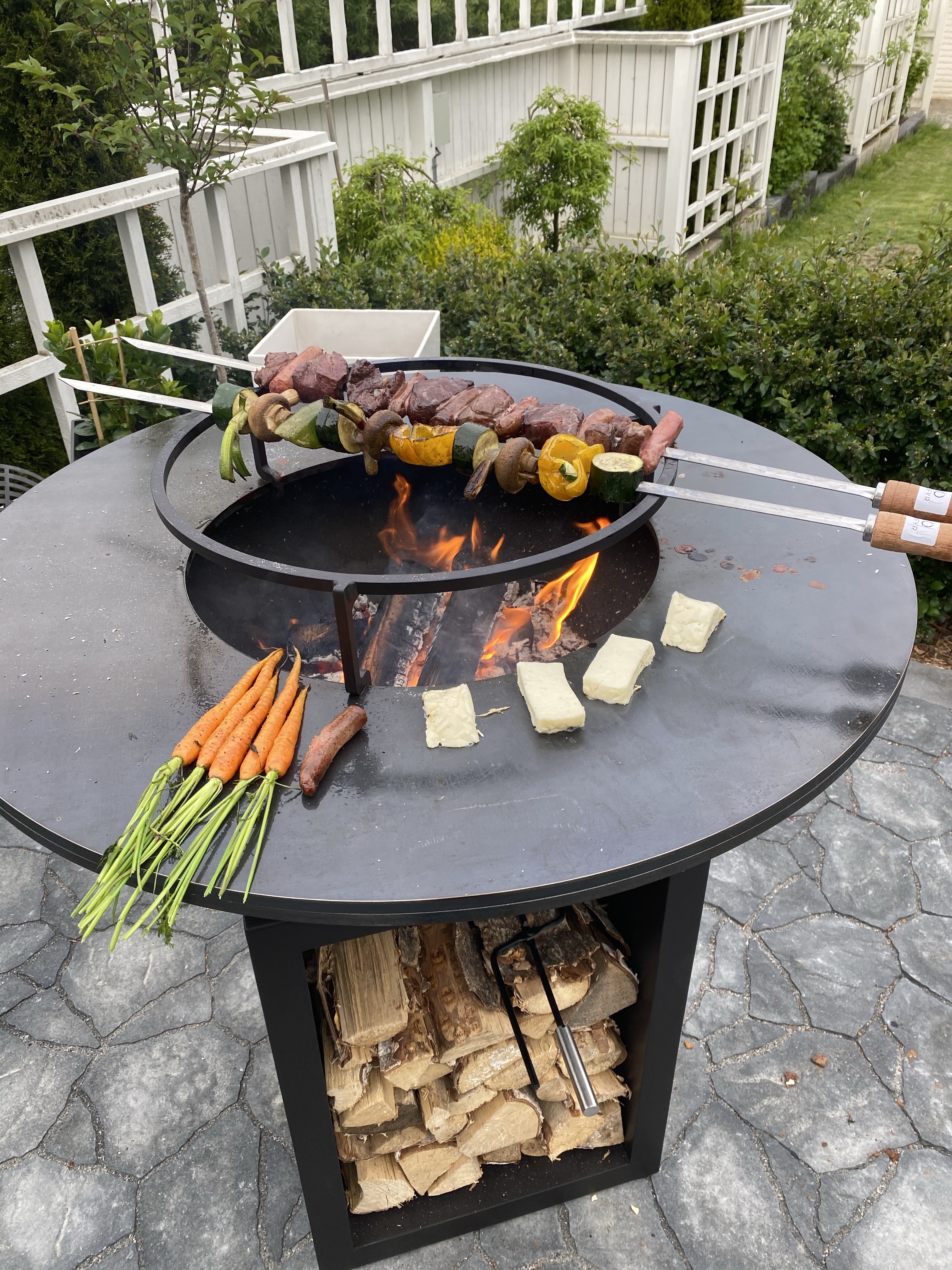 Minä otin vastuun grillaamisesta. Juhlapaikalle roudattiin ”keikka-Ofyr” ja laitettiin se briketeillä kuumaksi. Metsäpalovaroituksen vuoksi emme käyttäneet avotulta. Menuksi muodostui mahdollisimman yksinkertainen setti, joka on helppo toteuttaa neljän tunnin aikana isohkolle ruokailijajoukolle. Miekkoihin päätyi entrecote kahdella eri mausteella. Toisiin lihoihin tein yrtti-valkosipuliöljyn ja toiset maustoin Miss Klosen rubilla ja Jävla Sååsin bbq-kastikkeella.
