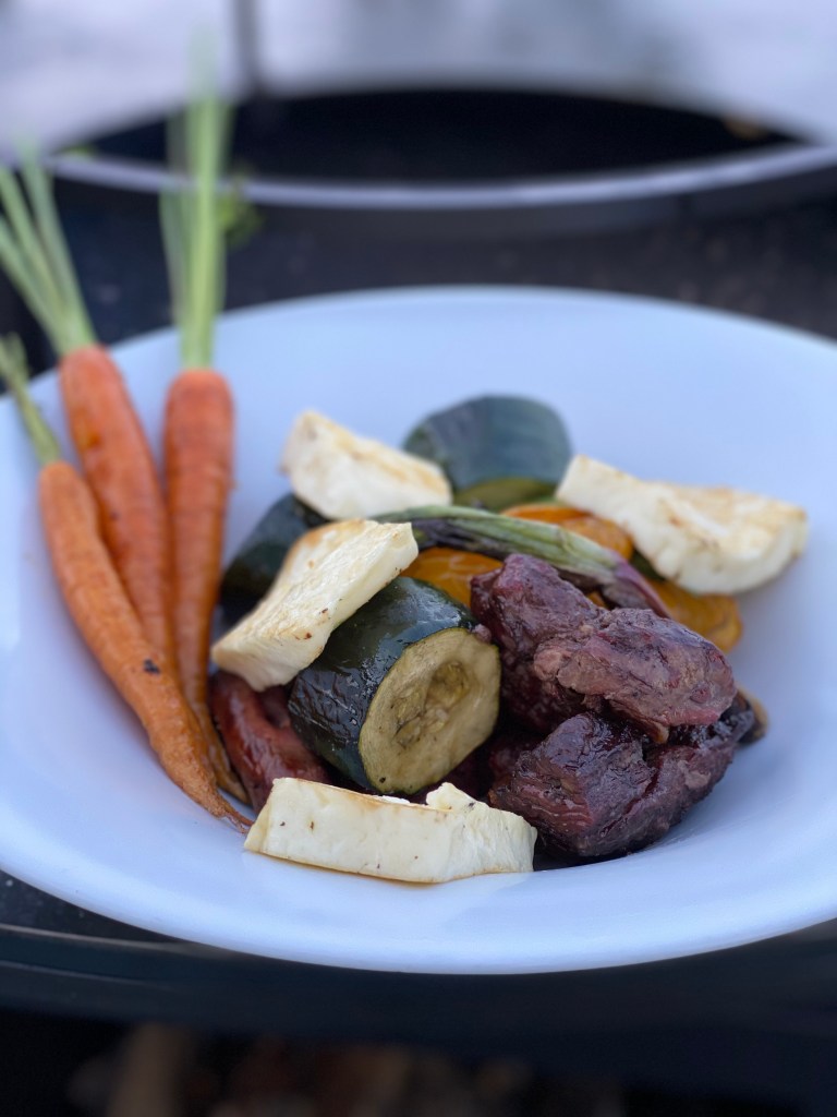 Kesäkurpitsat olivat omasta kasvihuoneesta ja saivat päälleen samaa yrttimarinadia kuin toinen liha. Porkkanat maustettiin vain suolalla ja pippurilla. Halloumit kruunattiin hunajalla ja oman maan mintunlehtisilpulla.