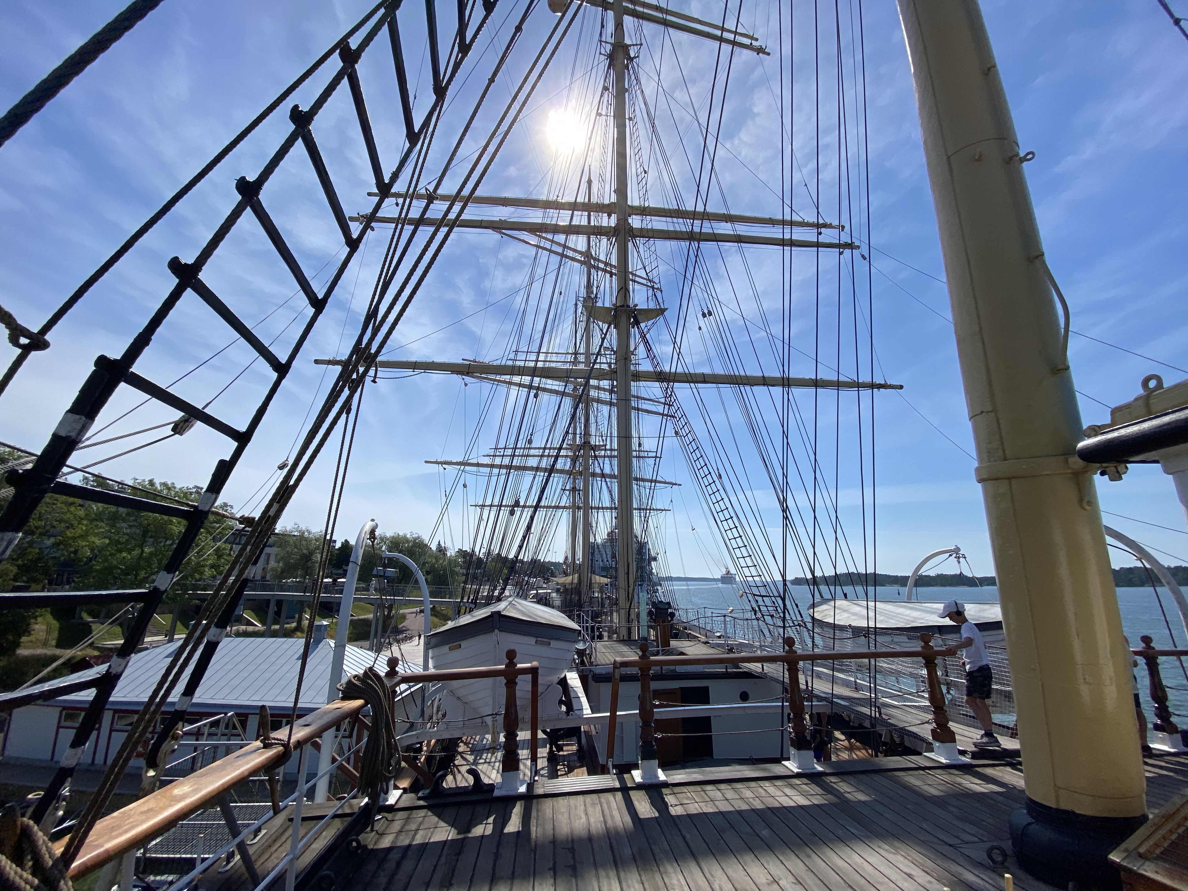 Maarianhaminassa otimme kiinni länsisatamaan, aivan ÅSS:n paviljongin viereen ennakkovaratulle kylkipaikalle. Parempaa paikkaa ei satamasta löydä! Uljas Pommern oli aivan keulan edessä, ravintola parin metrin päässä ja veneen kannelta pystyi seuraamaan ÅSS:n purjehduskisojen kipparikokouksia ja itse kisoja. Lisäksi 9-väyläinen frisbeegolfkenttä oli sadan metrin päässä.