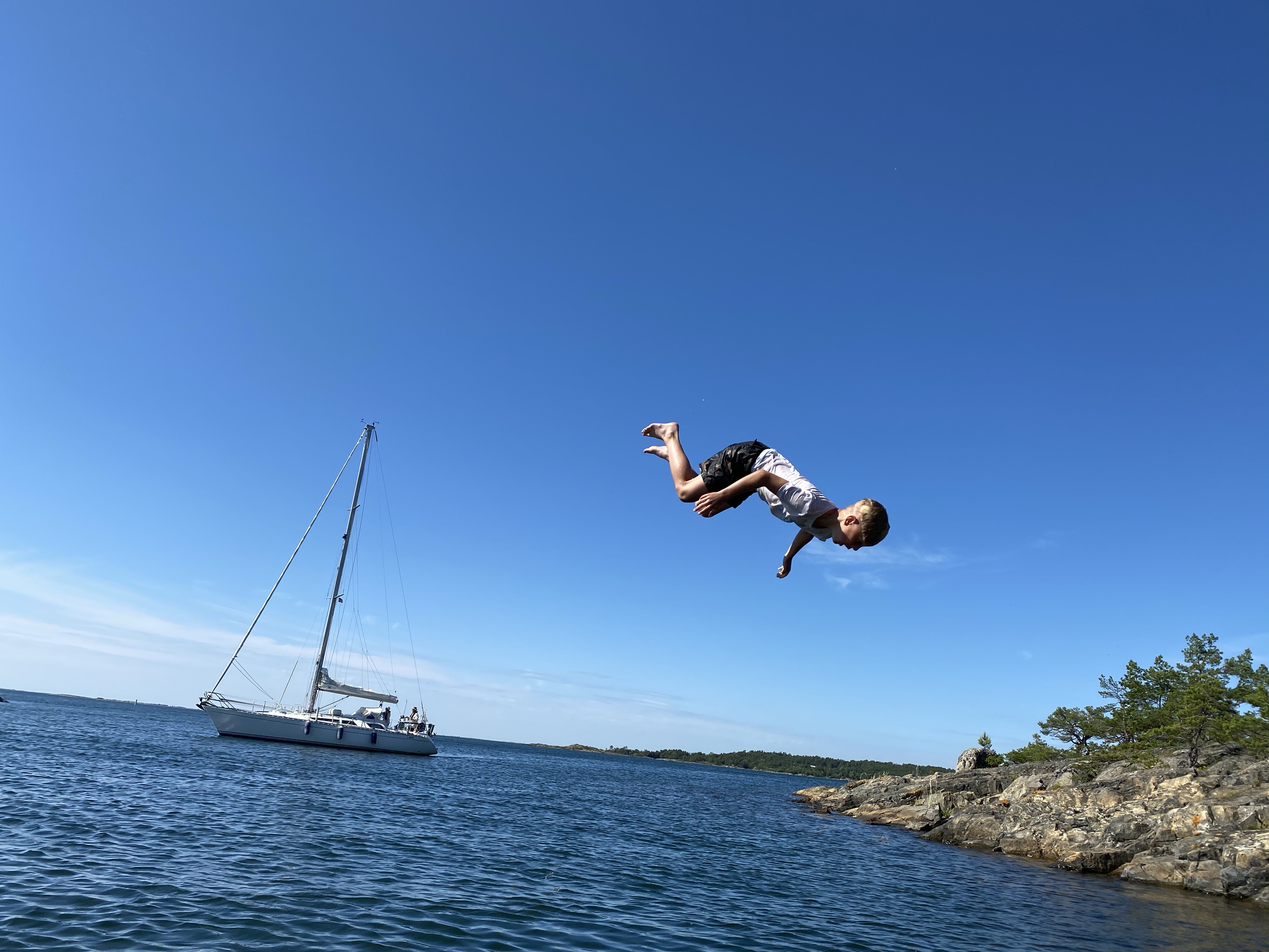 Aurinko paistaa aina välillä kuumasti ja välillä pilvien alla on jopa kylmä. Viimeisellä suoralla ennen Korpoströmiä jiippaamme ison ja nostamme vielä fokan. Saamme paikoitellen yhdeksän solmua vauhtia. Saavumme Korpoströmiin kahdessa tunnissa ja laskemme purjeet täyden sataman ohitettuamme. Ainoat vapaat poijut näyttävät olevan laiturin päässä, johon sivutuuli kaikkein pahiten osuu. Vaihtoehtona on jättää Maija ja Oliver tänne, käydä septitankilla ja jatkaa matkaa kohti länttä joko Brännskär, Gullkrona ja Stenskär satamina. En kuitenkaan halua lähteä kovaan tuuleen 10 ja 15-vuotiaan miehistöni kanssa katsomaan, josko satamissa olisi tilaa. Otamme siis kiinni poijuun ja jälleen kovassa sivutuulessa keulan kohti laituria. Kaikki menee tällä kertaa onneksi hyvin, vaikka laiturilla ei apuja löytynytkään.