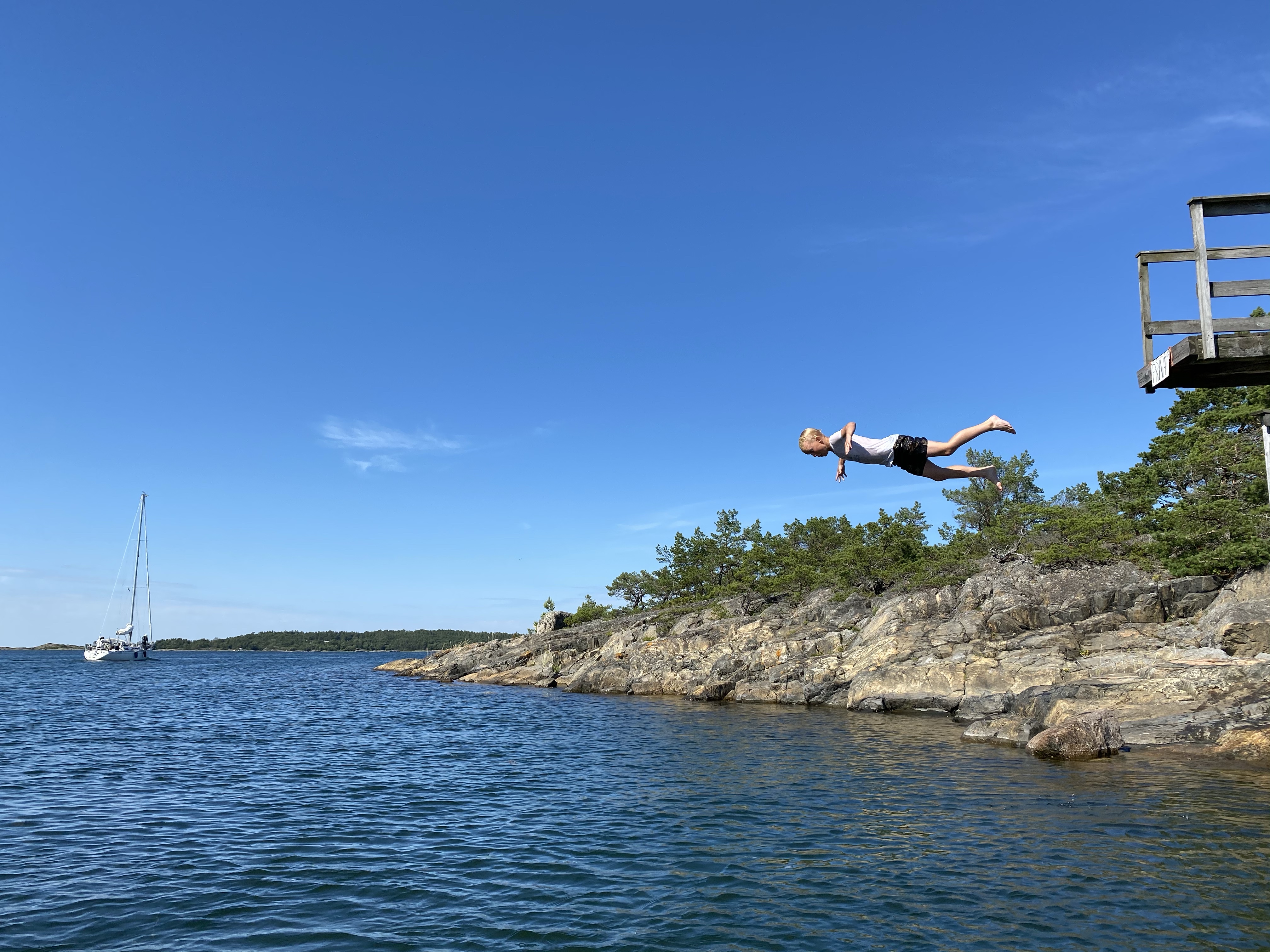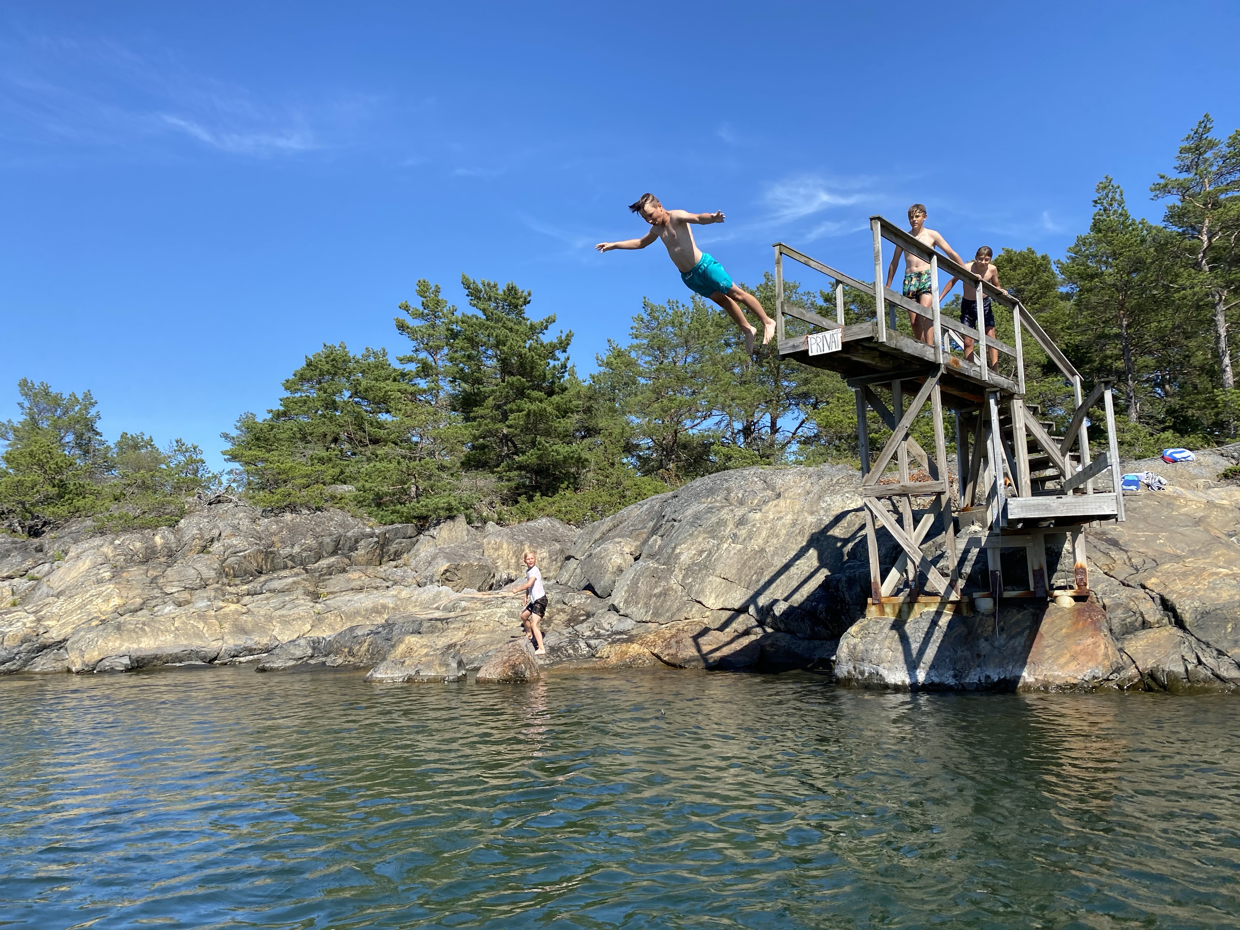 Föglössä ollessa viestittelimme ystäviemme Pomoellien kanssa, jotka olivat myös suunnanneet Hangosta kohti Ahvenanmaata. Yhteiseksi treffipaikaksi valikoitui jälleen Glada Laxen. Kukaan ei miehistöstä vastustanut ideaa, sillä hyppytorni, lauttasauna ja Henrikin ahvenet ovat kaikkien suosikkilistalla.