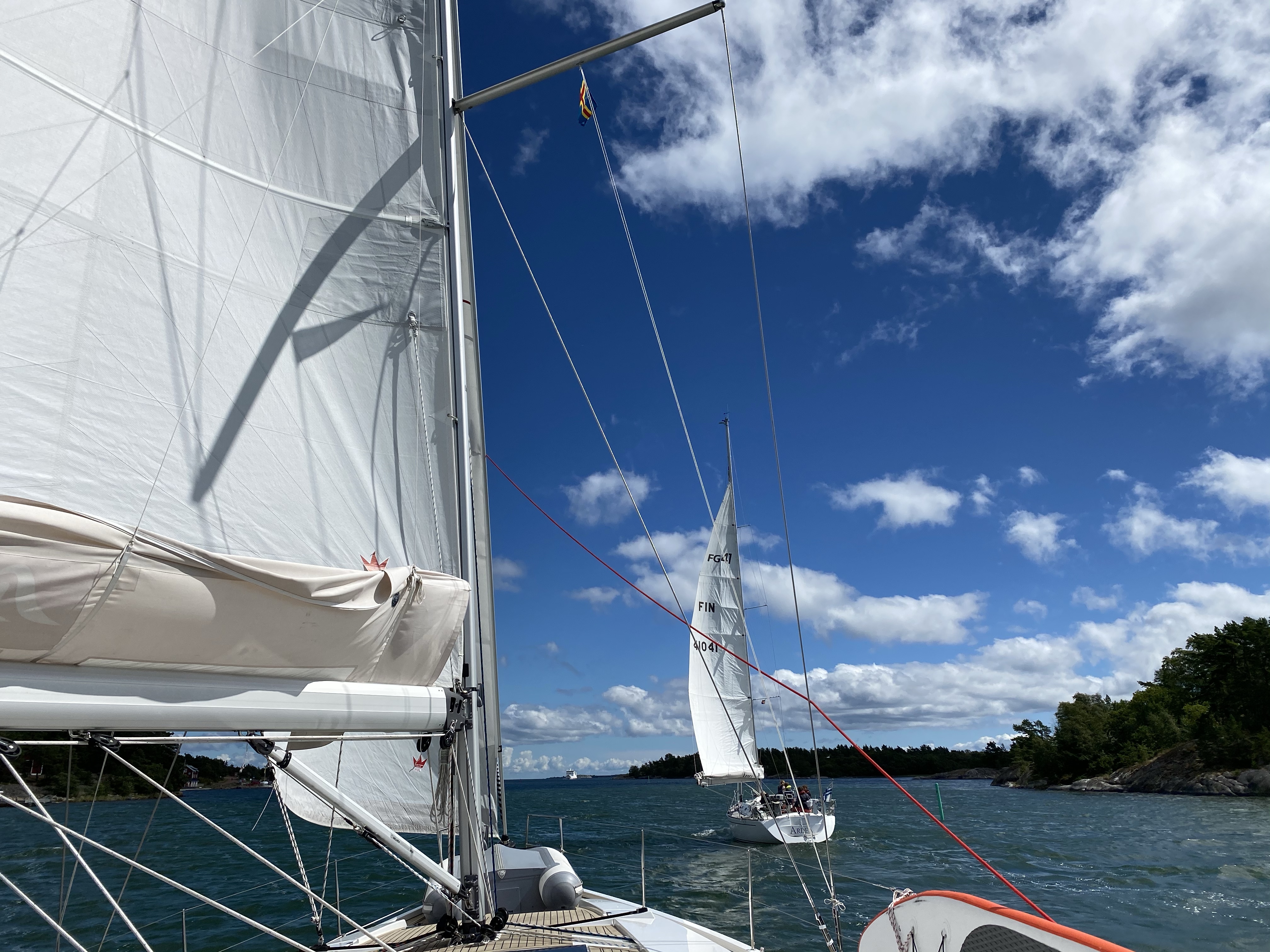 Purjeet nousivat pian satamasta lähdön jälkeen ja kilpa alkoi. Viime vuonna otimme selkäämme oikeastaan kaikilla tuulilla, mutta nyt veneemme tuntui kulkevan erinomaisesti. Viime kautena pohjaamme tarttui väärän maalivalinnan johdosta valtavat määrät merirokkoja ja leväkasvustoa ja tämä heikensi vauhtiamme. Kävi kuin Tapio Lehtisellä hanhenkauloineen. Talvella pohja putsattiin ja maalattiin uudelleen ja nyt ero Finngulfiin ei ollut enää iso. Kun tuuli nousi yli 7 m/s, olimme jopa nopeampia.