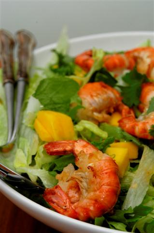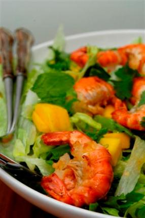 Poista ravuista suolet ja kuori ne. Kuori ja pilko mango sekä avokado siivuiksi. Revi salaatti suupalan kokoisiksi paloiksi. Sekoita avokadon ja mangon kanssa. Ripottele salaatin pinnalle hieman suolaa ja pirskottele päälle oliiviöljyä. Lämmitä öljy kuumaksi. Paista valkosipulia hetki. Lisää ravut ja paista kypsäksi. Lisää paiston loppuvaiheessa pannulle myös inkiväärit. Kaada pannun sisältö kokonaisuudessaan salaatin päälle.