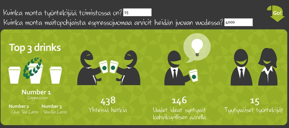 Mikäli et vielä rynnännyt kulmahuoneeseen vaatimaan sinunkin toimistoosi Starbucks Corner Café –konseptia, niin ei hätää. Uskoasi voit vahvistaa ”Starbucks Calculator” (varmaankin myös Registered Trademark) –nimisellä laskurilla. Esimerkiksi meidän Turun konttorimme tuottaa tämän uuden konseptin myötä (suomensin alle, sillä Starbucks Calculator ei valitettavasti osaa suomenkielen sijamuotoja):