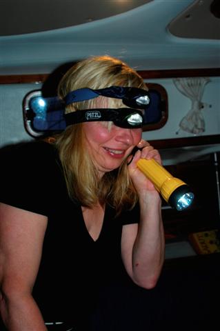 Kun ilta koitti ja ruoka oli pöydässä, laitoin veneen kaikki valot päälle ja kaivoin avuksi vielä kaksi otsalamppua ja yhden taskulampun. Josko niillä saisi edes vähän valaistua annosta! Pyysin anoppia auttamaan ja pitämään lamppuja. Säädin kameraani ja otin muutamia testikuvia. Kun nostin katseeni ruoasta, meinasin tippua penkiltä. Oli taas anoppi tarttunut hetkeen ja saanut oikein älynväläyksen! Kirjaimellinen valopää.