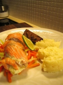 Sen kummempaa suunnitelmaa viikon menusta emme tehneet. Ostimme sitä, mikä näytti hyvältä – paljon hyviä raaka-aineita ja sitten luovuus kunniaan. Hauskaa ja palkitsevaa. Perjantairesepteiksikin kelpaavia annoksia on syntynyt melkein joka illallisella. Olikin hankala päättää tämän perjantain reseptiä. Päädyin tähän helppoon, mutta hyvään kalalautaseen. Suurimman osan saat kaupasta valmiina ja valmistamalla muutaman helpon asian itse, saat yleisön taputtamaan encoren… Ruoka toimii sekä alkuruokana että kevyenä lounaana.
