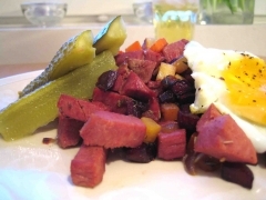 Kauho komeus lautaselle, paista kananmunat ja asettele annoksen päälle. Sivulle vielä hieman suolakurkkuja, niin herkku on valmis.