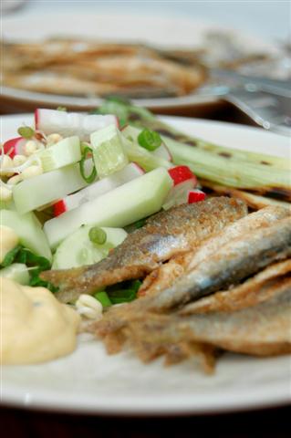 Paistettuja muikkuja, sattumasalaattia ja aїolia