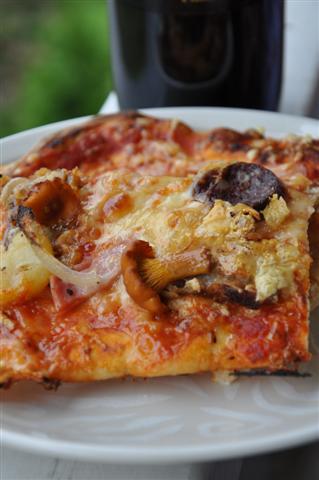 Tämä pizza on ns. ”pizza bianca”, eli ilman tomaattikastiketta. Lisää taikinan päälle reilusti mozzarellaraastetta. Asettele muut täytteet (smetanaa lukuun ottamatta) juuston päälle ja paista niin kuumassa uunissa kuin vain pystyt 8-10 minuuttia. Ota uunista ja nostele lusikalla smetanakekoja sinne tänne. Herkuttele!