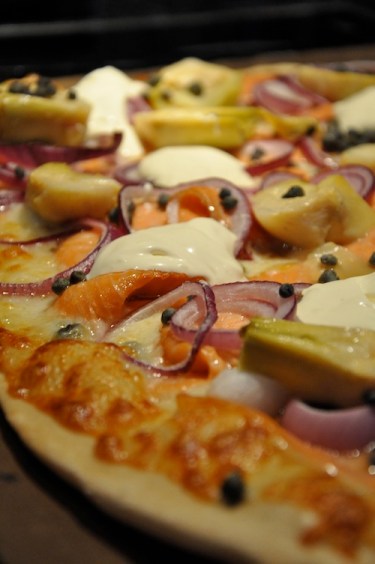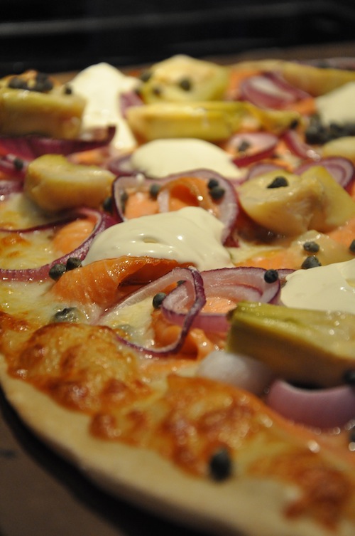 – mozzarellajuustoa reilusti – 200g kylmäsavulohta siivuina – 1 punasipuli siivuina – 8-10 artisokan sydäntä – puolikas pieni purkki pieniä kapriksia – 1 prk smetanaaVALMISTUS
