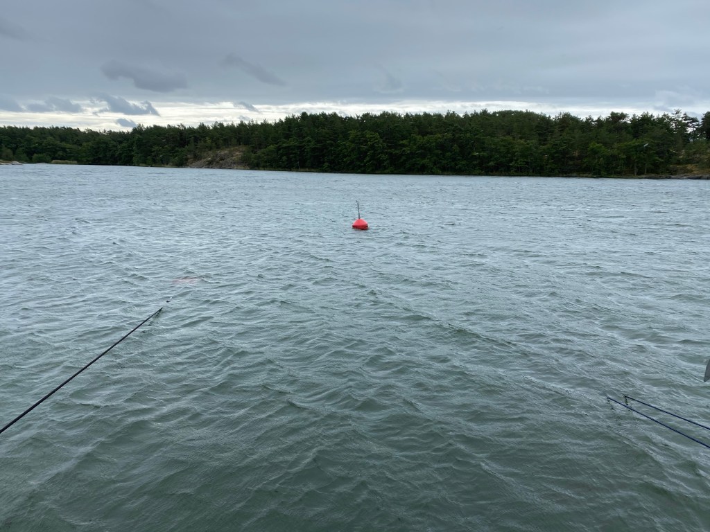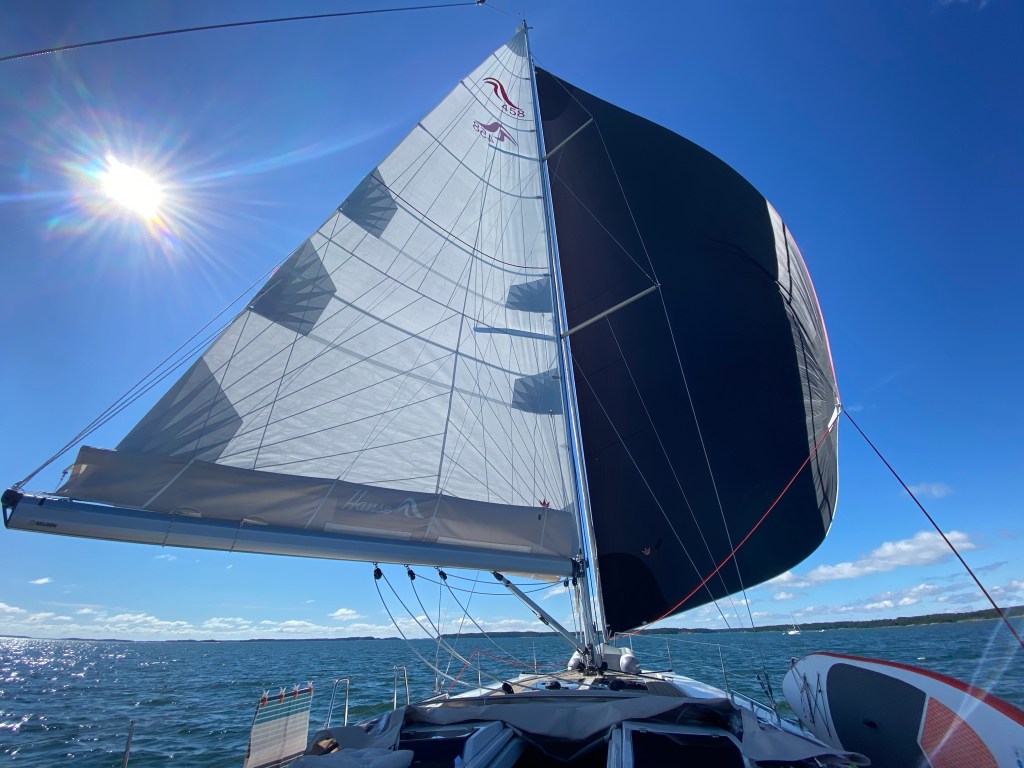 Tuuli oli kohtalainen. 8-10 m/s luoteesta ja puuskissa 14-15 m/s, joten lähdimme iso ykkösreivissä ja fokka vain osittain ulkona. Rullafokka ei mielestäni reivattuna toimi, vaan paukkuu, joten aika pian otimme sen kokonaan ulos. Välillä mentiin aikamoista kylkimyyryä, kun puuska iski saaren takaa. Pari kertaa broachaus oli lähellä, ellei jopa ihan tapahtunutkin.